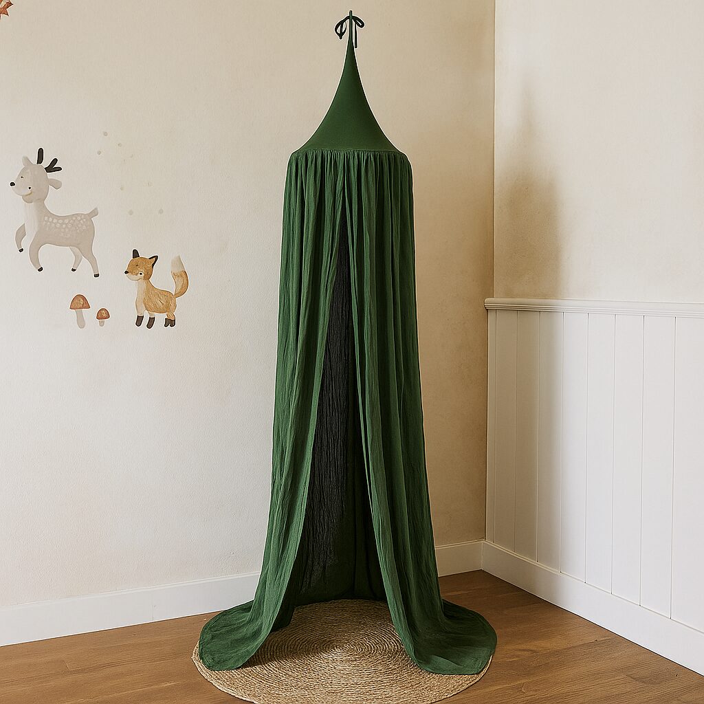 Mit diesem stilvollen Betthimmel aus erstklassigem Musselin-Stoff lässt sich das Kinderzimmer in ein zauberhaftes Märchenland verwandeln. Die beruhigende Atmosphäre wird durch die sanfte, dunkelgrüne Farbe und die luftige Beschaffenheit des Stoffes erzeugt, die zum Träumen einlädt. Neben seinem ästhetischen Wert hat der Betthimmel auch praktische Vorteile: Er kann mithilfe eines robusten Bambusrings und Bindebändern einfach aufgehängt und verschlossen werden, was Ihrem Kind ein Gefühl von Sicherheit und Geborgenheit vermittelt. Dieser Betthimmel bietet einen magischen Zufluchtsort für Spiel und Entspannung.