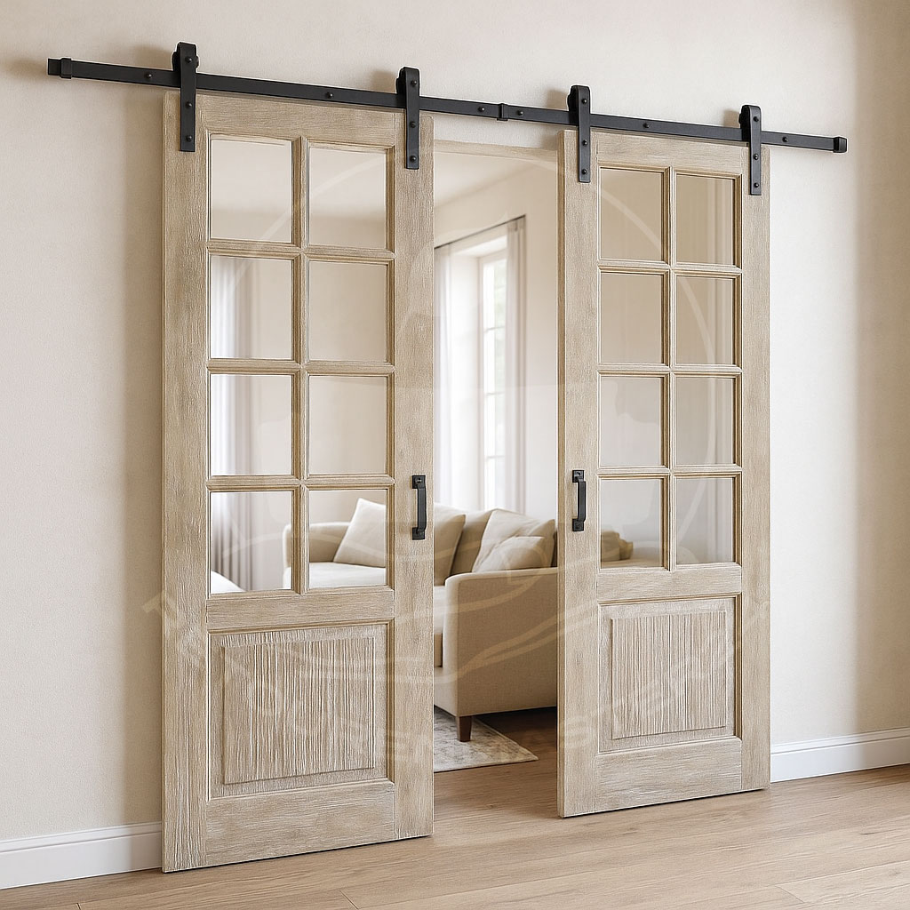 Innenarchitektur und Raumdesign, die sich durch Stilsicherheit und Kreativität auszeichnen, sind eine wahre Kunstform. Sie erzeugen eine Wohnatmosphäre, die sowohl komfortabel als auch ansprechend ist. Mit dieser eleganten Schiebetür aus erstklassigem Mangoholz können Sie selbst zum Designer werden und Ihrem Zuhause völlig neue Perspektiven bieten: Gestalten Sie neue Räume und private Bereiche. Die doppelflügelige Tür lässt in Sachen Stil und Eleganz keine Wünsche offen: Sie besticht durch ihre edlen Kassettentüren, feinen Sprossenfenster mit transparenten Glaseinsätzen und zieht jeden Betrachter in ihren Bann. Beide Seiten der Tür sind gleich gestaltet. Die beiden Türflügel sind an einer massiven Eisenschiene befestigt, die in der gleichen Farbe wie die Tür selbst gehalten ist, was zu einer harmonischen Gesamtwirkung führt. Die Türflügel lassen sich leicht entlang der Schiene verschieben, sodass Sie immer wieder neue visuelle Akzente in Ihrem Wohnbereich setzen können.
