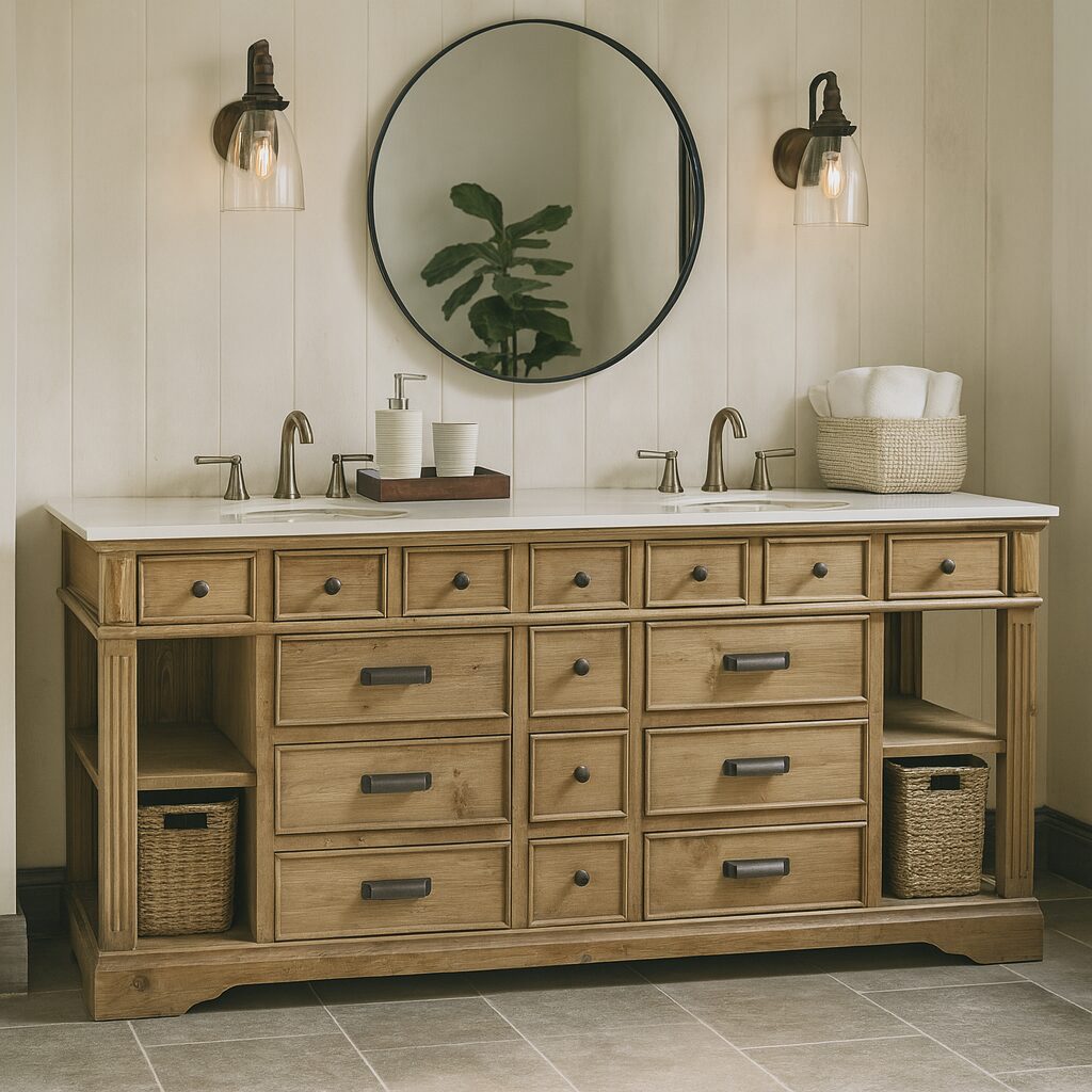 Ein wahres Luxusstück für Ihr Badezimmer! Dieser hochwertige Doppelwaschtisch ist wirklich ein lebenslanges Möbelstück. Mit großzügigen Abmessungen bietet er viel Platz für eine komfortable gemeinsame Nutzung, ideal für Paare oder Familien. Das elegante Modell besteht hauptsächlich aus Tannenholz und ist mit einem natürlichen Antik-Finish veredelt. Jedes Detail ist wunderschön und sorgfältig verarbeitet. Neun Schubladen und vier offene Regalfächer bieten ausreichend Stauraum für Kosmetik- und Beautyprodukte, Handtücher, Fön, Bürsten und mehr. Sieben Schubladen unterhalb der Waschbecken sind optische Blenden, alle anderen Schubladen sind funktional. Ein Traum für alle, die ihren Tag stilvoll beginnen möchten und ein hochwertiges, langlebiges Akzentstück im Landhausstil mit dem Charme vergangener Zeiten suchen. Achtung: dieser Waschtisch ist ohne Platte! Es ist nur der Korpus vorhanden.