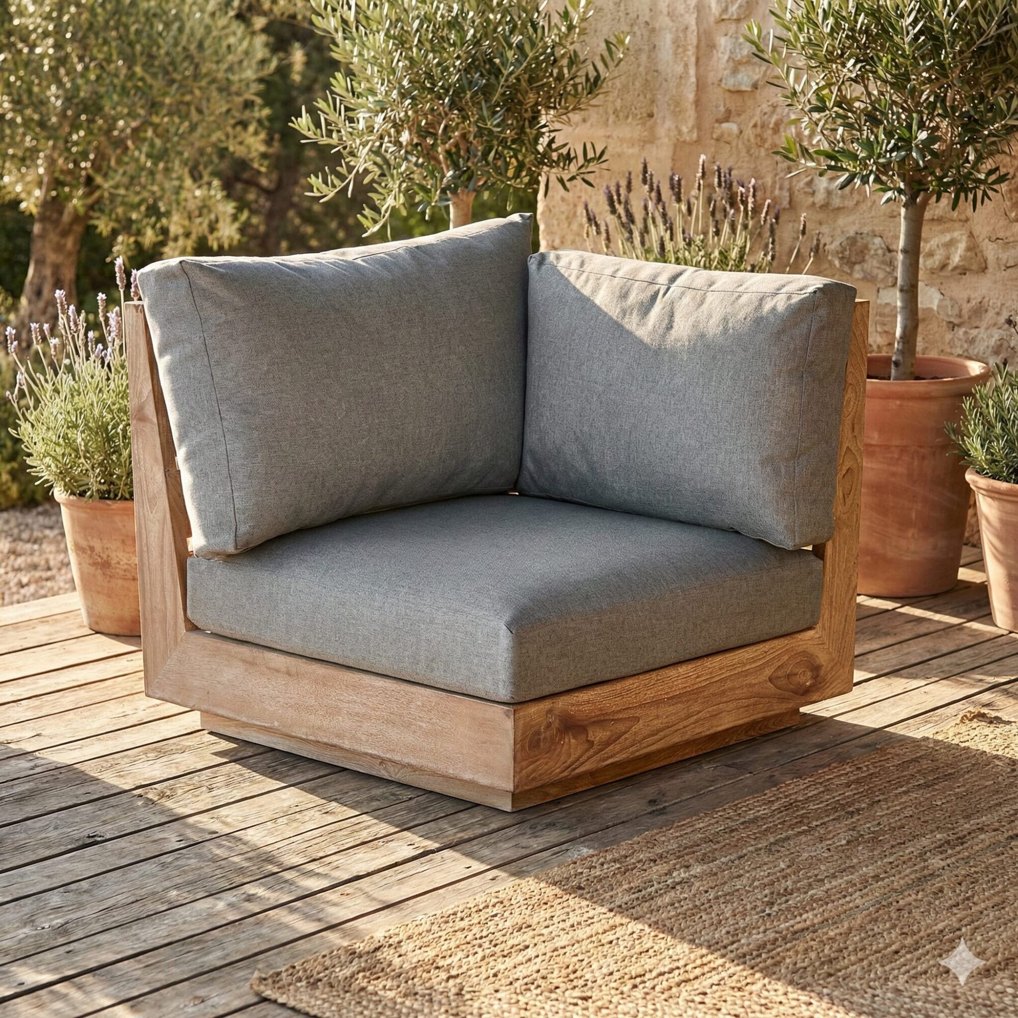Mit diesem stilvollen Eckelement können Sie Ihrem Garten oder Ihrer Terrasse ein luxuriöses Flair verleihen. Es kann als Einzelstück oder in Kombination mit anderen Modulen Ihrer Außensitzgruppe verwendet werden. Dieses aus Teakholz hergestellte Element mit einem raffinierten White-Washed-Finish betont die Struktur des Holzes und strahlt eine natürliche Anmutung aus. Die robusten, wetterbeständigen Kissenbezüge bieten Komfort und Langlebigkeit für viele entspannte Stunden im Freien. Dieses Eckelement ist nicht nur ein Möbelstück, sondern auch eine Verbesserung Ihrer Lebensqualität, die sowohl das Aussehen als auch den Komfort Ihres Außenbereichs erhöht. Mit den schnell trocknenden Olefin-Bezügen erhalten Sie das ideale Sitzmöbel für Terrasse und Balkon.