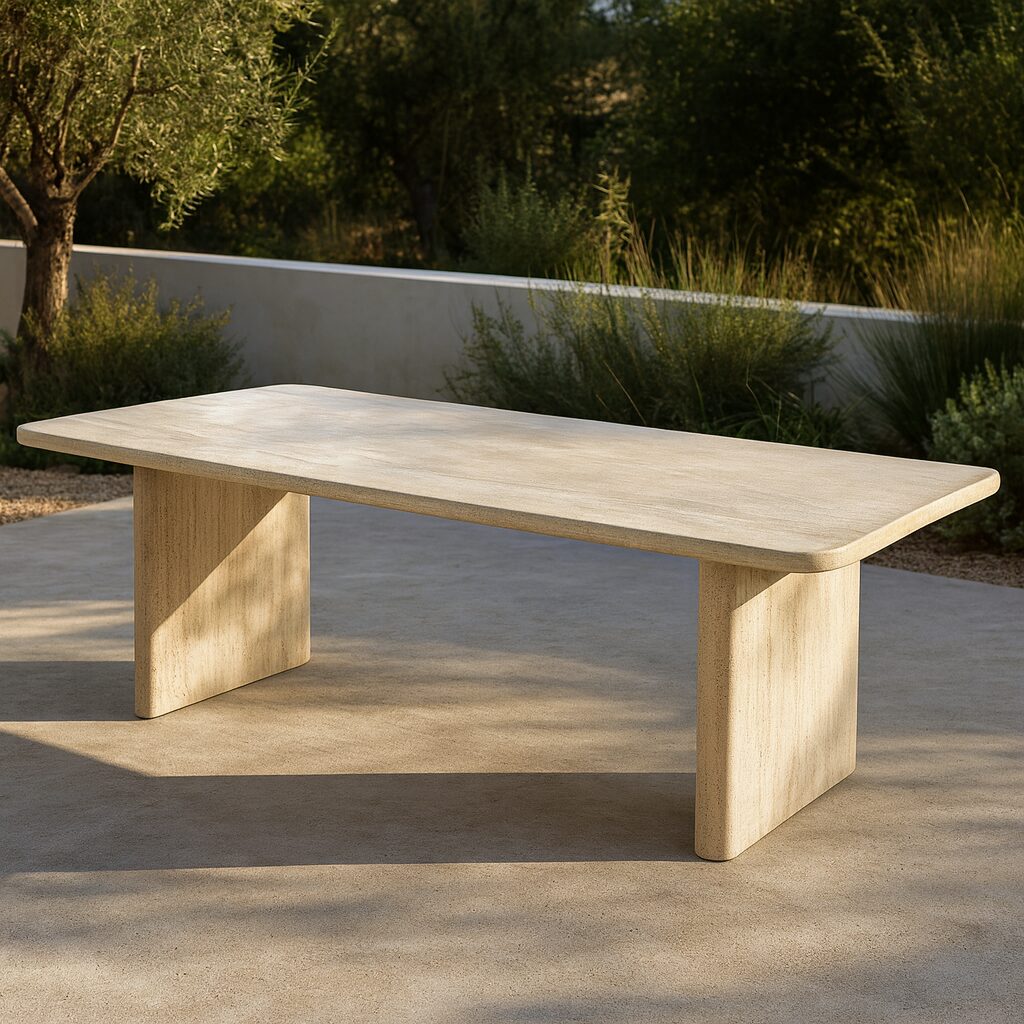 Dieser Esstisch verwandelt jeden Raum in eine einzigartige Stilinsel. Die Travertin-Optik holt das Ambiente mediterraner Landschaften direkt in die eigenen vier Wände und besticht durch ihr authentisches Aussehen, das die Anmutung natürlichen Steins einfängt. Der Tisch präsentiert sich mit einer Betonoberfläche in sanften Beige- und Creme-Nuancen, die von unverwechselbaren Maserungen durchzogen sind und jedes Modell zum Unikat machen. Ob platziert im Esszimmer oder in einer sonnenverwöhnten Küche – dieser Tisch ist mehr als nur ein Einrichtungsgegenstand, er ist ein Ausdruck von Stil. Seine Oberfläche ist robust und einfach zu reinigen, ohne dabei die ästhetische Anziehungskraft der naturgetreuen Steinoptik einzubüßen.