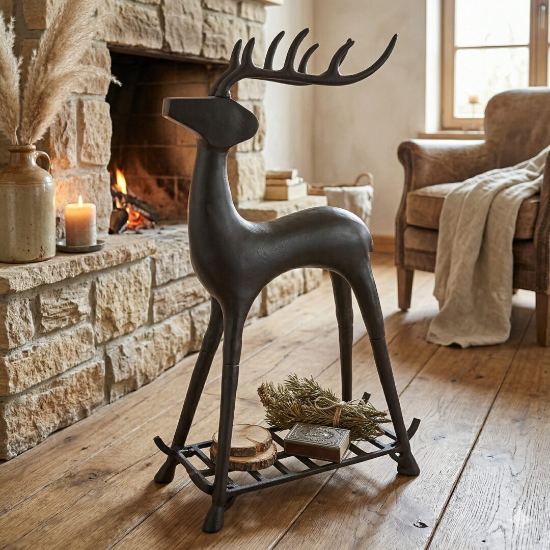 Dieser elegante Feuerholzhalter besticht mit seinem künstlerisch inspirierten Rentier-Design. Er wurde vollständig von Hand aus hochwertigem Aluminium gefertigt. Dieses freundliche Accessoire eignet sich ideal für die Aufbewahrung von Feuerholz, aber auch für Zeitschriften oder Bücher. Lassen Sie Ihrer Kreativität freien Lauf und verleihen Sie Ihrem Zuhause eine gemütliche Atmosphäre. Das rustikale Modell erinnert an eine verschneite Hütte und ist somit perfekt für die Winterzeit. Ob Sie das Feuerholz zur Dekoration nutzen oder den Kamin damit zum Knistern bringen möchten, bleibt ganz Ihnen überlassen – auf jeden Fall lassen sich damit äußerst charmante Dekorationen kreieren, die wunderbar zum Landhausstil passen.