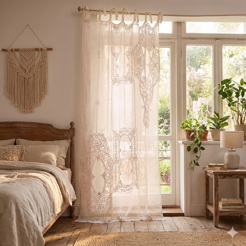 Die Gardine, die mit traditioneller Patchwork-Technik zusammengenäht wurde, besteht aus fein gearbeiteten Stickereien. Sie bietet Ihnen nicht nur einen charmanten und individuellen Look, sondern schützt auch vor neugierigen Blicken und schafft ein gemütliches Ambiente. Der zarte Vorhang aus einem pflegeleichten Baumwoll-Leinen-Gemisch lässt sich dank Bindebändern an jeder Gardinenstange einfach befestigen und in der Länge leicht anpassen. Ein zusätzlicher Pluspunkt ist, dass Sie mehr Zeit haben, um die selbstgemachte Variante Ihrer Mutter oder Großmutter zu vervollständigen, während Sie das perfekte Modell direkt vor Ihnen haben.