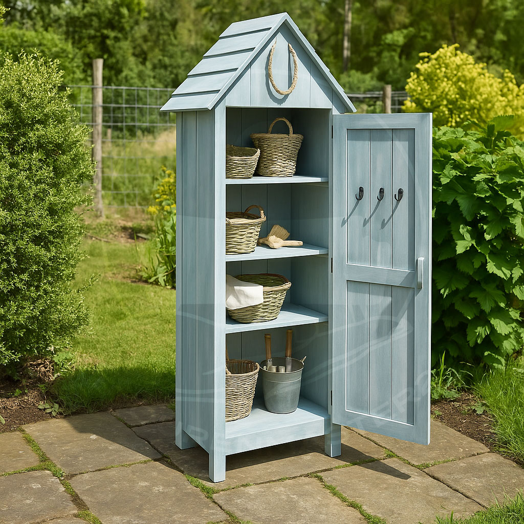 Blumentöpfe, Gartengeräte wie kleine Harken und Schaufeln, Zwiebelsetzer, Saatgut und Zwiebeln – all diese Dinge brauchen einen Platz, wenn sie gerade nicht gebraucht werden. Dieses Gartenhäuschen bietet eine praktische und ansprechende Lösung. Es sichert diese Utensilien sicher vor den Elementen. Hergestellt aus hochwertigem Tannenholz, das mit einem hellblauen Anstrich versehen wurde, erinnert das Häuschen in seinem Design an die kleinen Strandhäuschen der Nordseeküste. Zur Verstärkung dieses Flairs wurde ihm im Giebelbereich maritimes Tau eingearbeitet. Auf diese Weise wird an Boote, Meeresbrise und Sand unter den Füßen erinnert, was eine Strandatmosphäre schafft. Das untere der vier Fächer ist etwas größer als die anderen und perfekt für Blumentöpfe und Blumenerde geeignet. Die anderen Fächer bieten Platz für Gartenschnur, Scheren und weiteres Saatgut. Alles, was zu klein ist, um direkt auf den Regalen platziert zu werden, kann in kleinen Boxen aufbewahrt werden. Gegenstände mit Schlaufen finden ihren Platz an der Innenseite der Tür, wo vier stabile Haken angebracht sind. Wenn Sie einen Pool im Garten haben, eignet sich dieses Häuschen auch zur Aufbewahrung von Badezubehör und Pflegeprodukten.