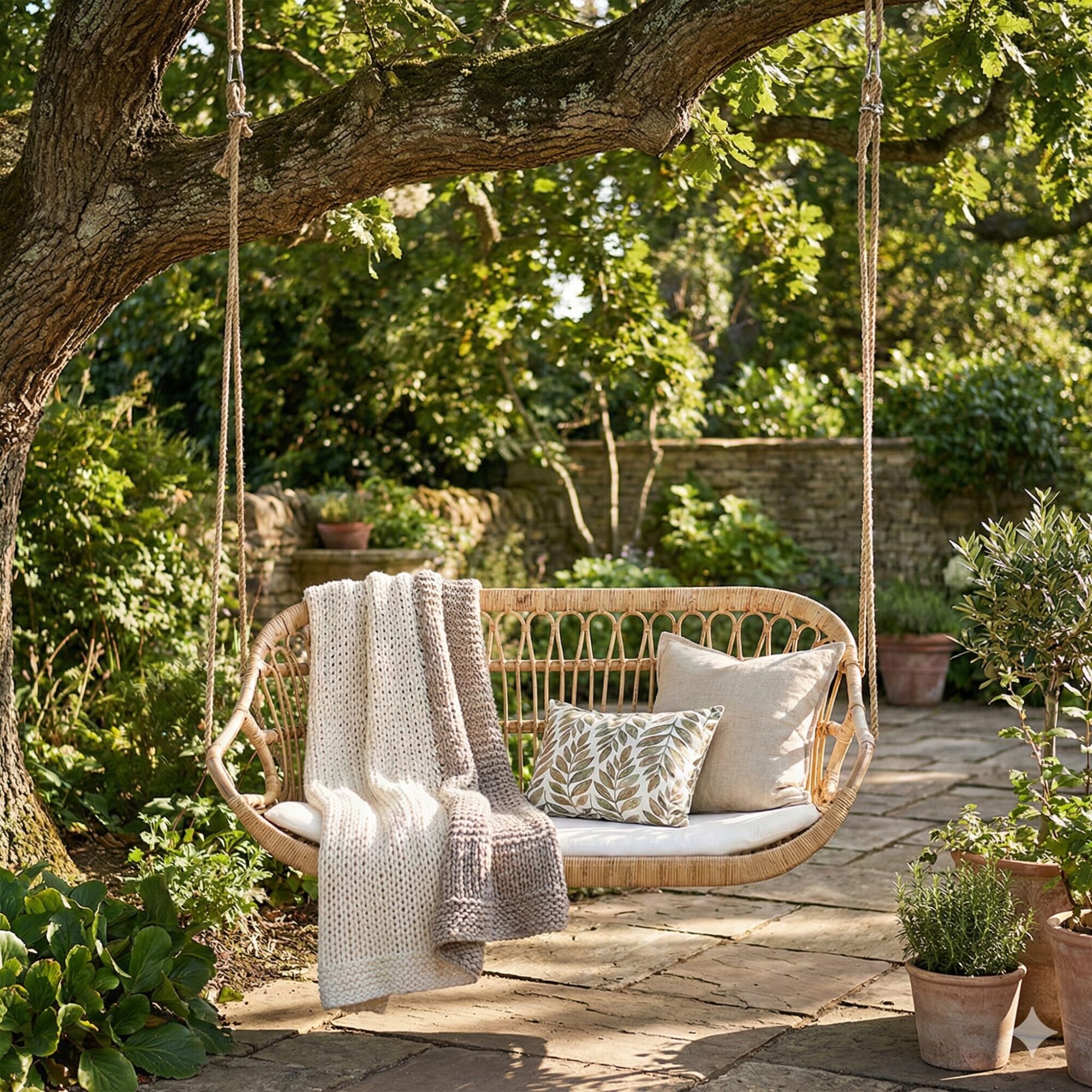 Gibt es einen schöneren Ort, um die Seele baumeln zu lassen als in einer Hängebank? Unserer Meinung nach nicht! Es ist kein Wunder, dass diese moderne Variante der klassischen Hollywoodschaukel derzeit einen regelrechten Boom erlebt und unsere Gärten und Wohnräume erobert. Denn nichts ist so verlockend wie ein bequemes Sitzmöbel, das gleichzeitig mit sanften Schaukelbewegungen verwöhnt. Wir wissen jetzt, dass diese Bewegungen auch bei gestressten Erwachsenen eine beruhigende und entspannende Wirkung haben können. Was diese Hängebank so einzigartig macht, ist die gelungene Kombination aus Komfort, anspruchsvollem Design und natürlichem Flair. Das kunstvoll von Hand geflochtene Gestell besteht aus dem Naturmaterial Rattan, das filigrane Leichtigkeit mit einer erstaunlichen Stabilität vereint. Die Form der Hängebank erinnert an ein gemütliches Nest, in dem Sie bald jede freie Minute verbringen werden – sanft schwebend zwischen Himmel und Erde, während Sie lesen, plaudern oder einfach die Augen schließen. Das bequeme abnehmbare Polsterkissen hat einen Bezug aus einem bewährten Baumwolle-/Polyester-Mix, der sowohl hautfreundlich als auch strapazierfähig ist. Trend-Tipp: Diese Bank kann auch im Wohnraum aufgehängt werden. Haben Sie vielleicht einen Platz an einem großen Fenster, wo Sie sanft schaukelnd den Panoramablick über die Stadt genießen können?