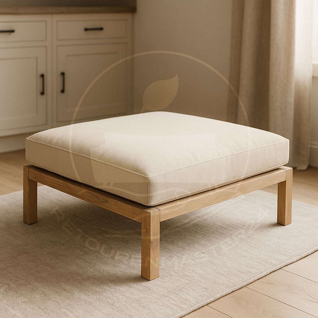 Die Kombination aus minimalistischem Design und hochwertigen Materialien schafft zeitlos ansprechende Möbelstücke. Daher verfügt dieser Hocker über vier schlanke Beine und eine Sitzfläche, die in traditioneller Lattentechnik hergestellt wurde. Ausgewählt wurde dafür das kostbare Teakholz. Dieses tropische Edelholz zeichnet sich durch seine besondere Härte und Dichte aus. Es ist durch seinen natürlichen Ölgehalt sehr wasserbeständig und sogar resistent gegen Schimmel und Pilzbefall. Daher kann der Hocker problemlos auf Ihrer Terrasse oder dem Balkon platziert werden. Um nicht nur visuellen Genuss, sondern auch luxuriösen Sitzkomfort zu bieten, haben wir ein dickes Kissen hinzugefügt. Dieses ist relativ fest und formbeständig gepolstert und sein Bezug fühlt sich an, als wäre er aus Naturfasern gefertigt. Tatsächlich besteht er jedoch aus robustem und vor allem wasserabweisendem Polyester, das eine angenehme Textur mit hervorragenden Nutzungseigenschaften verbindet, die insbesondere im Außenbereich geschätzt werden. Dank des Abperleffekts werden Regentropfen nicht aufgesogen, sondern perlen einfach ab. Um ein Verrutschen des Kissens zu verhindigen, beispielsweise wenn Sie in dem passenden Sessel (20441) sitzen und Ihre Füße auf dem Hocker ablegen, wird es mit Klettverschlüssen an den Latten befestigt.