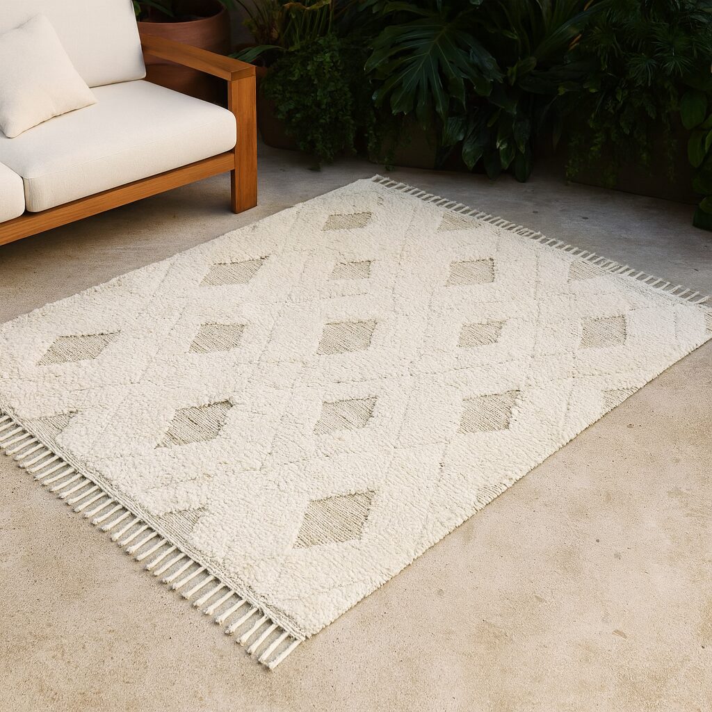 Es ist kaum zu glauben, dass dieser Teppich aus recycelten Plastikflaschen hergestellt wurde, da seine Textur so luxuriös und weich wie die eines Baumwollteppichs ist. Er hat auch andere bemerkenswerte Merkmale: Er ist außergewöhnlich widerstandsfähig, haltbar und wetterfest. Weder Feuchtigkeit noch intensive Sonneneinstrahlung können ihm etwas anhaben. Das getuftete Rautenmuster gibt dem gewebten Teppich nicht nur einen modischen Boho-Chic, sondern auch eine ansprechende Hoch-Tief-Struktur, die durch dekorative Fransen an den schmalen Seiten stilvoll ergänzt wird. Dieser exquisite Alleskönner passt sich jederzeit Ihren Wohnbedürfnissen an – im Sommer als bequemer Outdoorteppich auf dem Balkon oder der Terrasse, in den kalten Monaten als gemütlicher Akzent in Ihrem Wohnzimmer oder Wintergarten.