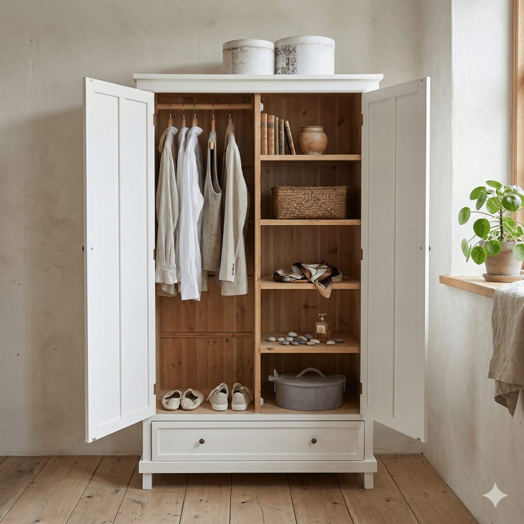 Dieser prächtige Kleiderschrank fügt klassische Schönheit und natürlichen Charme in einer harmonischen Verbindung zusammen. Sein antikes Außenfinish erzeugt eine Atmosphäre der Leichtigkeit, während die unbehandelten Oberflächen aus Kiefernholz im Inneren seine authentische Persönlichkeit betonen. Mit fest integrierten Regalböden und einer handlichen Kleiderstange stellt dieser Schrank eine gut durchdachte Lösung für Ordnung und Übersicht dar. Egal ob im Schlafzimmer, im Flur oder in der Garderobe, dieser Schrank kombiniert praktische Funktionen mit einem unaufdringlichen, zeitlosen Design.