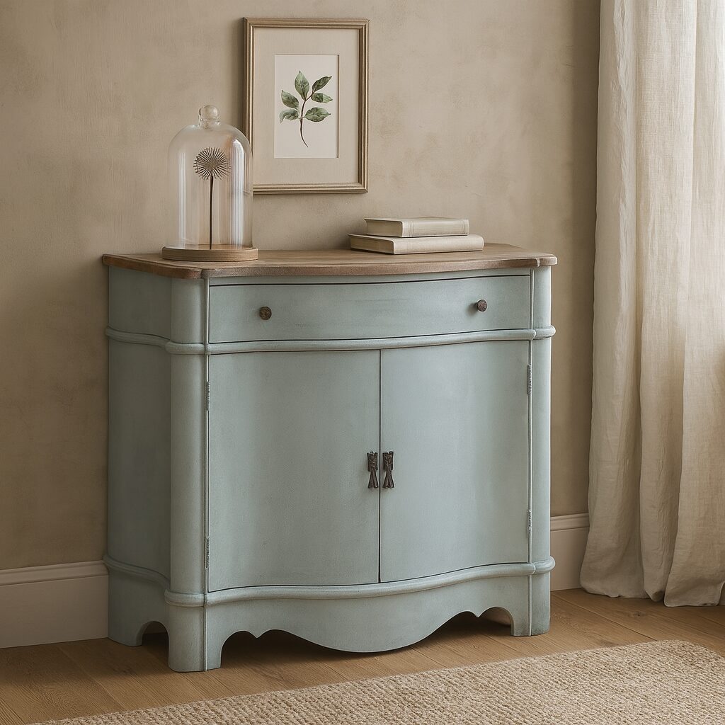 Die anmutige Eleganz des französischen Riviera-Chic hat immer eine besondere Faszination ausgeübt und dient als Inspiration für diese atemberaubende Kommode. Sie ist meisterhaft aus robustem Kiefernholz gefertigt und mit einer antiken Lackierung versehen, um einen Vintage-Look zu erzeugen. Der wellenförmige Korpus, der eine große Schublade und zwei Türen umfasst, verleiht dem Möbelstück eine raffinierte und spielerische Eleganz. Diese wird durch die massive Ablageplatte, die durch ihr White-Washed-Finish hervorsticht, noch weiter betont. Die wunderschönen Türgriffe, zwei Schubladenknöpfe und der kunstvoll geschnitzte Sockel vervollständigen das Bild. Dieses stilvolle und wertvolle Stück bietet viel Stauraum und fügt sich sowohl in eine Vintage-Einrichtung als auch in ein modernes Interieur harmonisch ein.