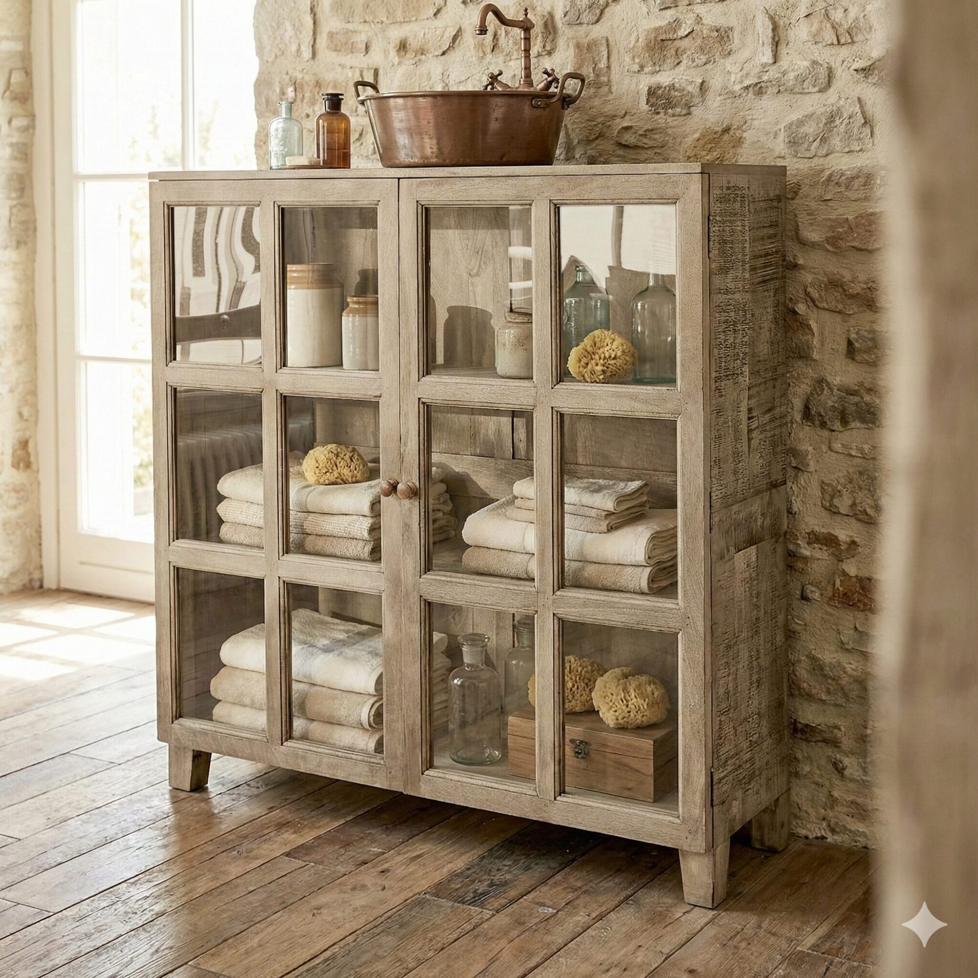Diese Kommode strahlt in ihrer handwerklichen Vollendung einen reichen ländlichen Charme aus, behält dabei jedoch durch die erstklassige Qualität des massiven Mangoholzes einen modernen Touch. Die lasierte und gewachste Oberfläche hebt die natürliche Maserung und Farbe des Holzes hervorragend hervor. Die dekorativen Glastüren im Design eines Sprossenfensters verleihen dem Möbelstück eine visuelle Leichtigkeit und ermöglichen gleichzeitig einen Einblick in den Innenraum, der mit drei großzügigen Fächern viel Platz zur Verfügung stellt. Die perfekte Balance zwischen Design und Funktion macht dieses Möbelstück zu einer ausgezeichneten Wahl sowohl für ein Landhaus-Interieur als auch für eine an Vintage orientierte Einrichtung. In der Küche kann es als Geschirrschrank dienen, im Wohnzimmer bietet es Platz für Bücher oder die Präsentation von dekorativen Accessoires.