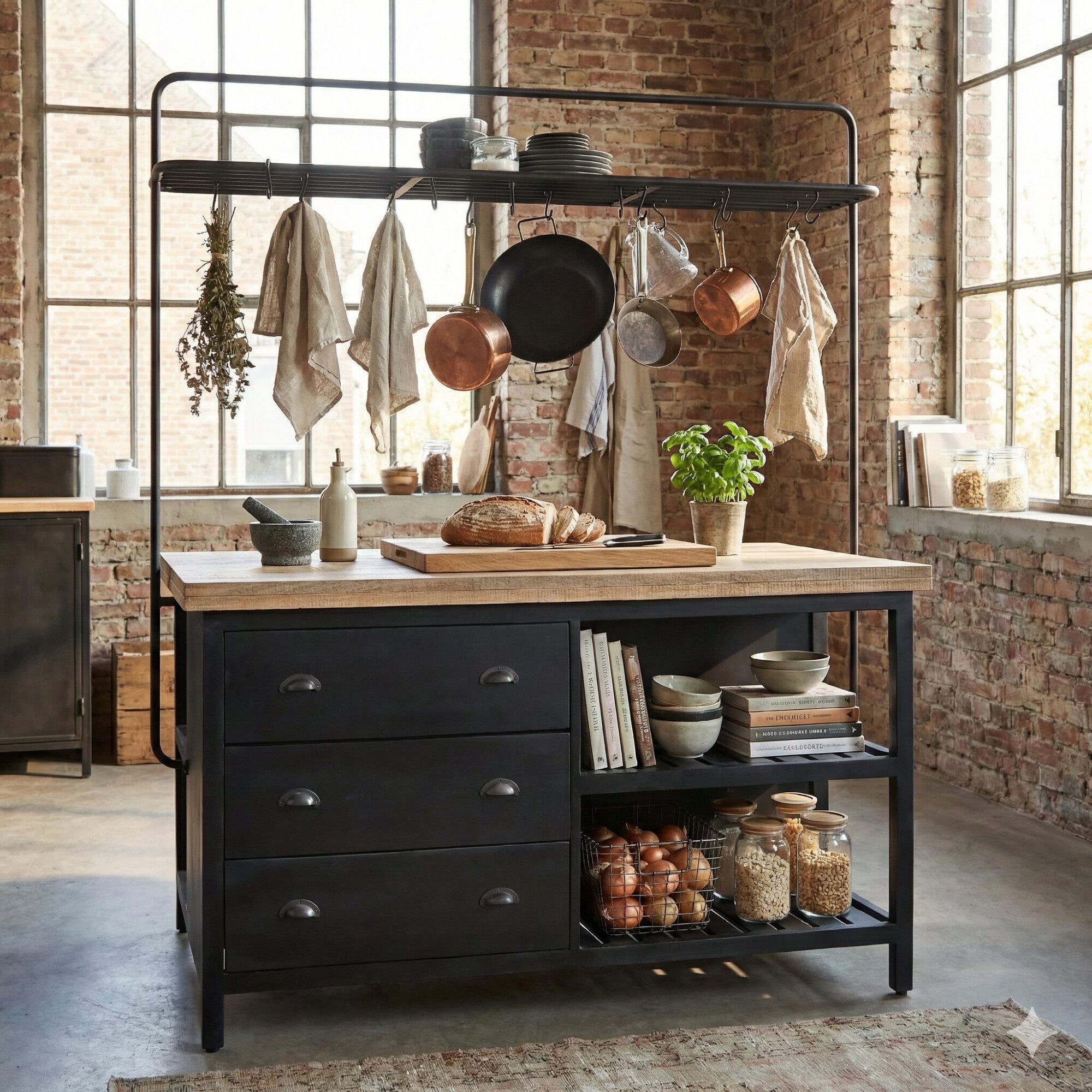 Immer mehr Menschen entdecken die Freude am Kochen. Aus diesem Grund wurde dieser Küchenblock als eine von allen Seiten zugängliche Insel konzipiert, wodurch Ihre Freunde beim nächsten ‚Kochduell‘ auch mithelfen können. Neben einer großzügigen Arbeitsfläche bietet der Küchenblock viel Stauraum in drei Schubladen und offenen Fächern. Egal ob Korkenzieher, Fleischthermometer oder Gemüsehobel benötigt werden – das passende Werkzeug ist schnell griffbereit. Die offenen Regalfächer bieten Platz für Kochbücher oder auch für Ihre große Salatschüssel oder Großmutters Suppenterrine. Zusätzlich verfügt der Küchenblock über Extras, die ihn in jeder Küche zum Blickfang machen. Dazu gehören eine Gitterablage in Kopfhöhe, inspiriert von Profi-Küchen, sowie eine raffinierte Aussparung in der Mitte der Arbeitsfläche, in der beispielsweise Kräutertöpfe Platz finden können. Das trendige Industrial-Style-Design dieses Küchenblocks besteht aus einer markanten Materialkombination aus Eisen und massivem Mangoholz, die im Küchenalltag ebenso strapazierfähig wie pflegeleicht ist.