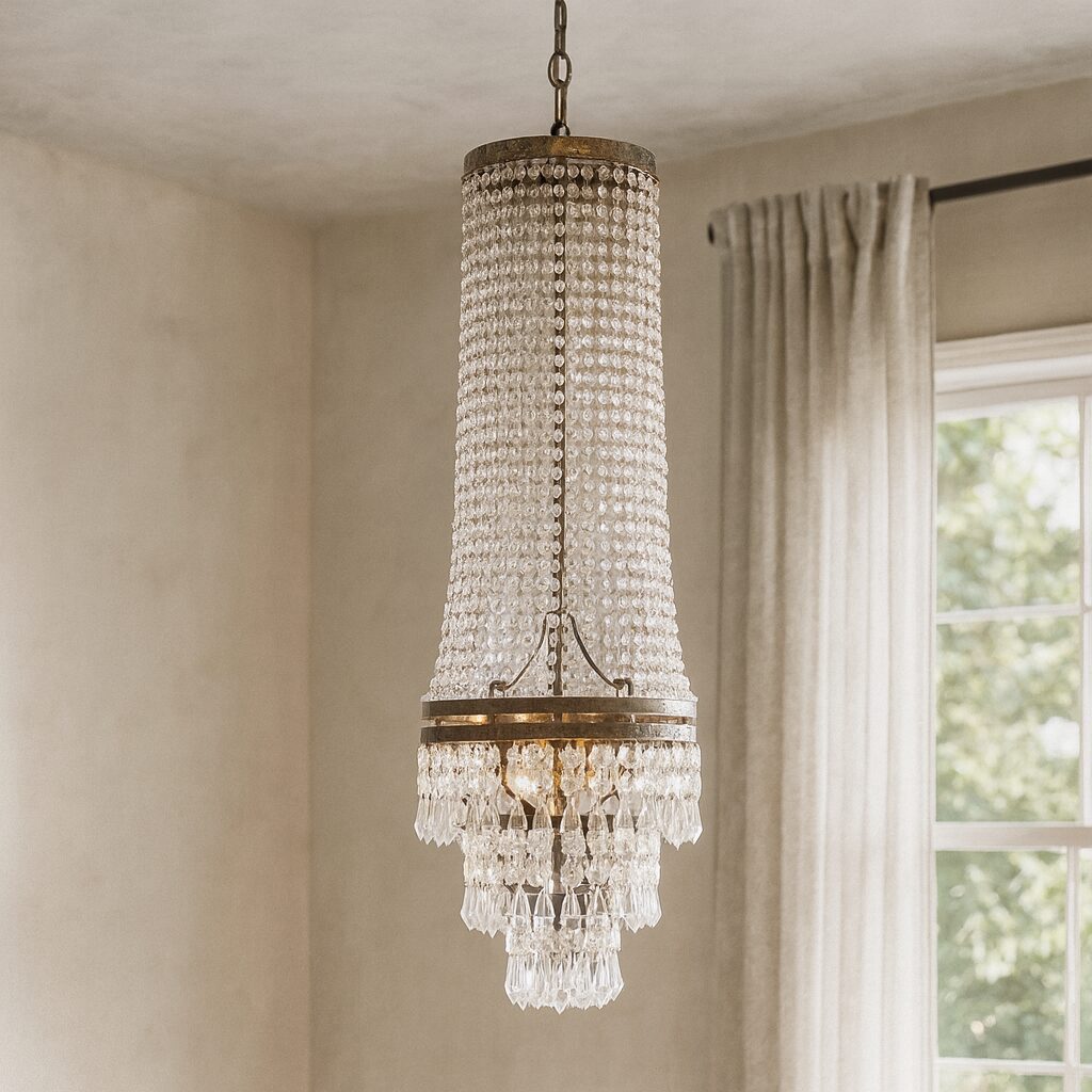 Beschreibung: Dieses opulente Schmuckstück, das mit seiner nostalgischen Ausstrahlung jedem Raum einen Hauch von Glamour verleiht, ist ein wahrer Hingucker. Das elegante Gestell, gefertigt aus Eisen und veredelt mit einem Antik-Finish, ist mit einer Vielzahl von Glasprismen verziert. Diese sorgen für eine helle Beleuchtung und faszinierende Lichteffekte, wenn das Licht sich in den gläsernen Elementen bricht. Sein großzügiges und luxuriöses Design macht es zu einem auffälligen Mittelpunkt, egal ob im Wohn- oder Schlafzimmer. Tauchen Sie ein in den Charme vergangener Tage und erfreuen Sie sich an diesem dekorativen und qualitativ hochwertigen Vintage-Design, das perfekt zum Shabby-Chic Stil passt.