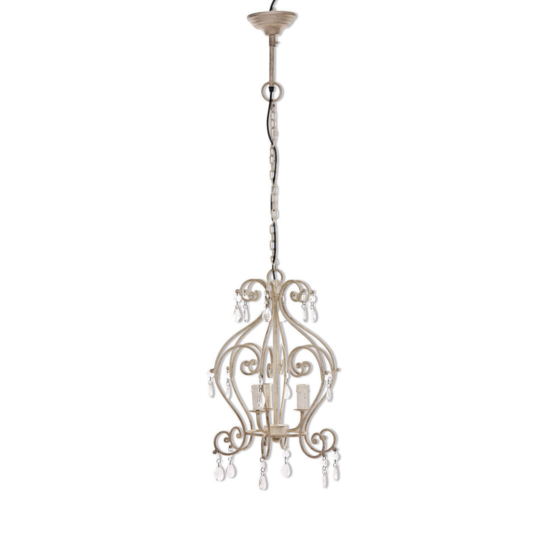 Ein fast königliches Juwel, das durch seine erlesene Schönheit besticht. Der Leuchter strahlt in luxuriösem Glanz und verzaubert durch sein romantisch geschwungenes Eisen-Gestell. Funkelnde Glas-Prismen schmücken dieses und verleihen ihm einen zusätzlichen Reiz. Drei Glühbirnen beleuchten das kunstvolle Design und schaffen eine exquisit schöne Lichtatmosphäre. Am Lampensockel finden sich kleine Tropfenformen, die geschmolzenes Wachs perfekt imitieren. Es scheint, als ob dieser Leuchter aus einer längst vergangenen Zeit stammt und damals, wie es üblich war, mit Kerzen betrieben wurde. Ein charmantes kleines Detail. Darüber hinaus ist dieses elegante Kunstwerk, ob beleuchtet oder nicht, ein wahrer optischer Genuss. Es passt perfekt zum Shabby-Chic-Stil und wird das Herz jedes Romantikers höher schlagen lassen. Eine ausgezeichnete Wahl für Wohn- oder Schlafzimmer, die Ihnen lange Freude bereiten wird. Reiner Luxus mit einem Hauch von Charme – ein unverzichtbares Lieblingsstück.