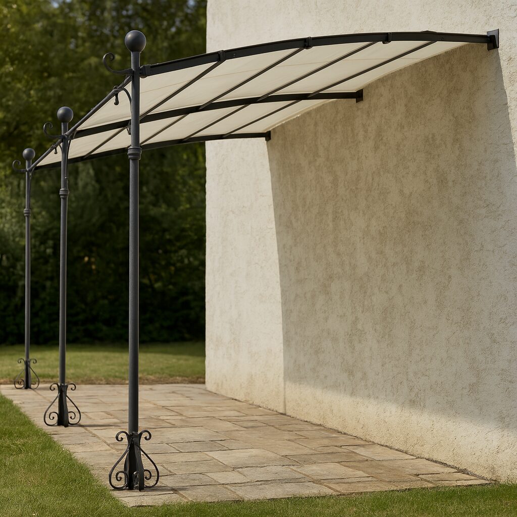 Herzlich willkommen in Ihrem neuen sommerlichen Rückzugsort, der Sie in eine Welt eleganter Behaglichkeit entführt. Das Dach dämpft das helle Sonnenlicht und bietet einen angenehmen Schatten, wobei eine sanfte Brise durch die offenen Seiten streicht und so eine stickige Atmosphäre auch an heißen Sommertagen verhindert. Diese klassische Anbaupergola wurde speziell für diejenigen entwickelt, die in ihrem Garten keinen Raum für einen freistehenden Pavillon haben. Sie wird an der Hauswand oder einer anderen Außenwand befestigt und das elegant geschwungene Dach wird von drei Säulen getragen. Obwohl die Konstruktion leicht und luftig erscheint, ist sie dennoch stabil und sicher, da sie vollständig aus robustem, pulverbeschichtetem Eisen besteht, das optimalen Widerstand gegen Witterungseinflüsse bietet. Das Dach besteht aus einer widerstandsfähigen Kunstfaser, die sich durch hervorragende Robustheit und Witterungsbeständigkeit auszeichnet. Aber diese Pergola wird nicht nur durch ihre praktischen Vorteile Ihren Garten im Sommer bereichern, sie wird auch als echtes Highlight und Blickfang wirken. Kenner werden sofort erkennen, dass die Ornamente der Pergola von der französischen Schmiedekunst inspiriert sind, die jedem Objekt diese bewundernswerte Eleganz verleiht. Im Winter empfehlen wir, das Dach zu entfernen, um seine Langlebigkeit zu gewährleisten.