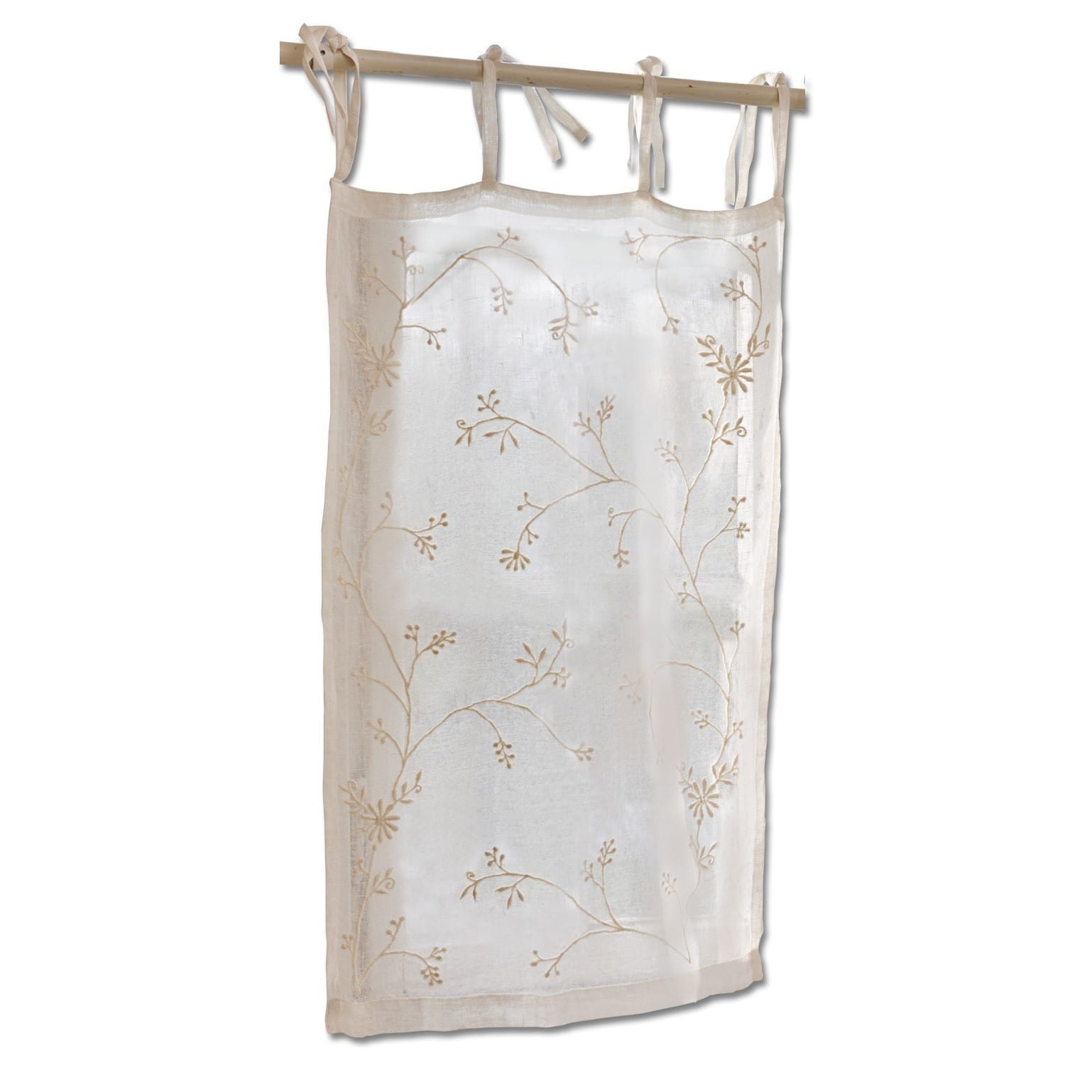 Die reine Leinen-Scheibengardine, die sich durch ihren schmalen Schnitt auszeichnet, besticht durch eine Ton-in-Ton-Stickerei im floralen Design und eine exzellente Fertigungsqualität. Dieser nützliche Sichtschutz, der traditionell in der Küche anzutreffen ist, verwandelt sich in einen entzückenden Fensterschmuck, der jedem Wohnraum eine zusätzliche Note von Behaglichkeit und Einzigartigkeit verleiht. Ein besonderes Merkmal sind die Bindebänder, die sich mühelos um jede Gardinenstange binden lassen und den romantischen Stil hervorheben.