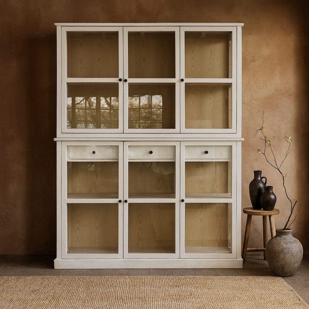 Dieser Vitrinenschrank präsentiert sich transparent mit seiner eleganten Glasoberfläche, die den Blick auf sein Inneres ermöglicht. Seine charmanten Sprossenfenster sind vollständig mit Glas versehen. Als geradliniges Upcycling-Möbelstück besteht der Schrank aus recyceltem Tannenholz, das in seinem natürlichen Zustand belassen wurde, um die wahre Schönheit des Holzes hervorzuheben. Er bietet mit sechs Türen und vier Regalböden reichlich Stauraum. Der Vitrinenschrank dient nicht nur als großzügiger Stauraum, sondern auch als perfekte Bühne für Ihre Bücher, Weingläser, Porzellan oder Wohnaccessoires, die damit garantiert im Mittelpunkt stehen. Ein weiterer Vorteil ist seine geschlossene Konstruktion, die keinen Staub eindringen lässt. Ihre Lieblingsstücke sind somit gut geschützt und trotzdem immer im Blickfeld.