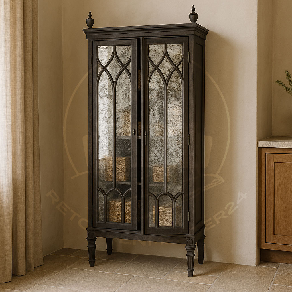 Dieses auffällige Stück verleiht jedem Raum einen besonderen Vintage-Charme. Das dunkle Holz ist sorgfältig gestaltet, und die kunstvolle Verarbeitung wird perfekt durch die herrlichen Spiegelflächen in altertümlicher Antik-Optik ergänzt. Es entsteht ein unvergleichlicher Anblick, der das Gefühl vermittelt, als ob dieses schöne Stück die letzten 100 Jahre in einem alten Schloss oder einer Burg verbracht hat, in Erwartung, wieder zum Leben erweckt zu werden.