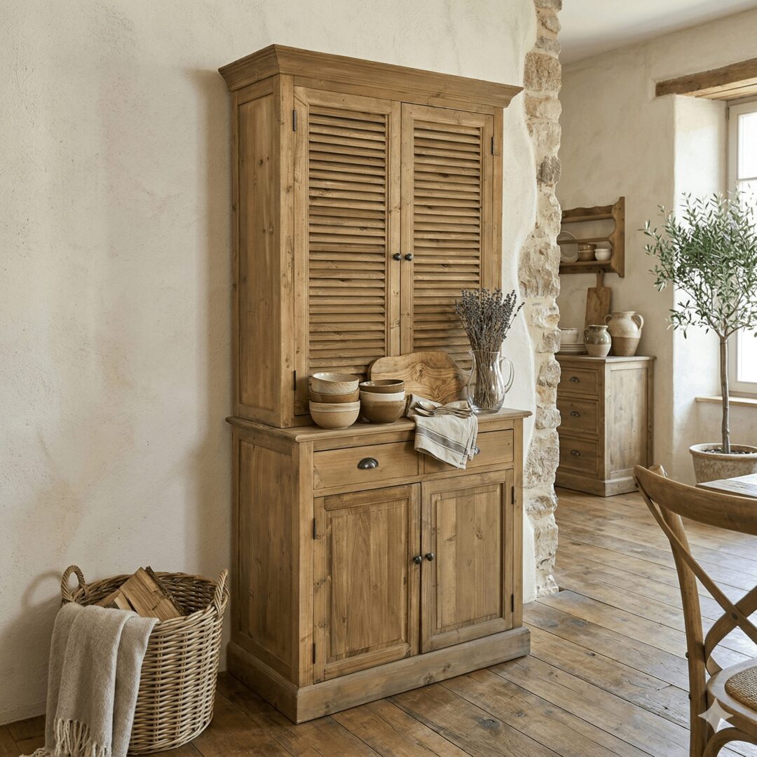 Ein Möbelstück, das eine behagliche Landhausstimmung hervorruft: Der Buffetschrank präsentiert sich mit einer charakteristischen Holzstruktur in natürlicher Optik und strahlt dadurch eine besondere Authentizität aus. Die Lamellentüren im oberen Abschnitt verleihen ihm eine luftige Leichtigkeit, während die geschlossenen Türen im unteren Teil für eine subtile Ordnung sorgen. Zwei Schubladen stellen Stauraum für Besteck oder kleine Gegenstände zur Verfügung, während die geräumige Ablagefläche zwischen dem oberen und unteren Segment ideal zum Ausstellen von Geschirr oder dekorativen Lieblingsstücken ist. Der Schrank kombiniert praktischen Stauraum mit einem zeitlosen Charme und wird dadurch schnell zum zentralen Element jeder Einrichtung.