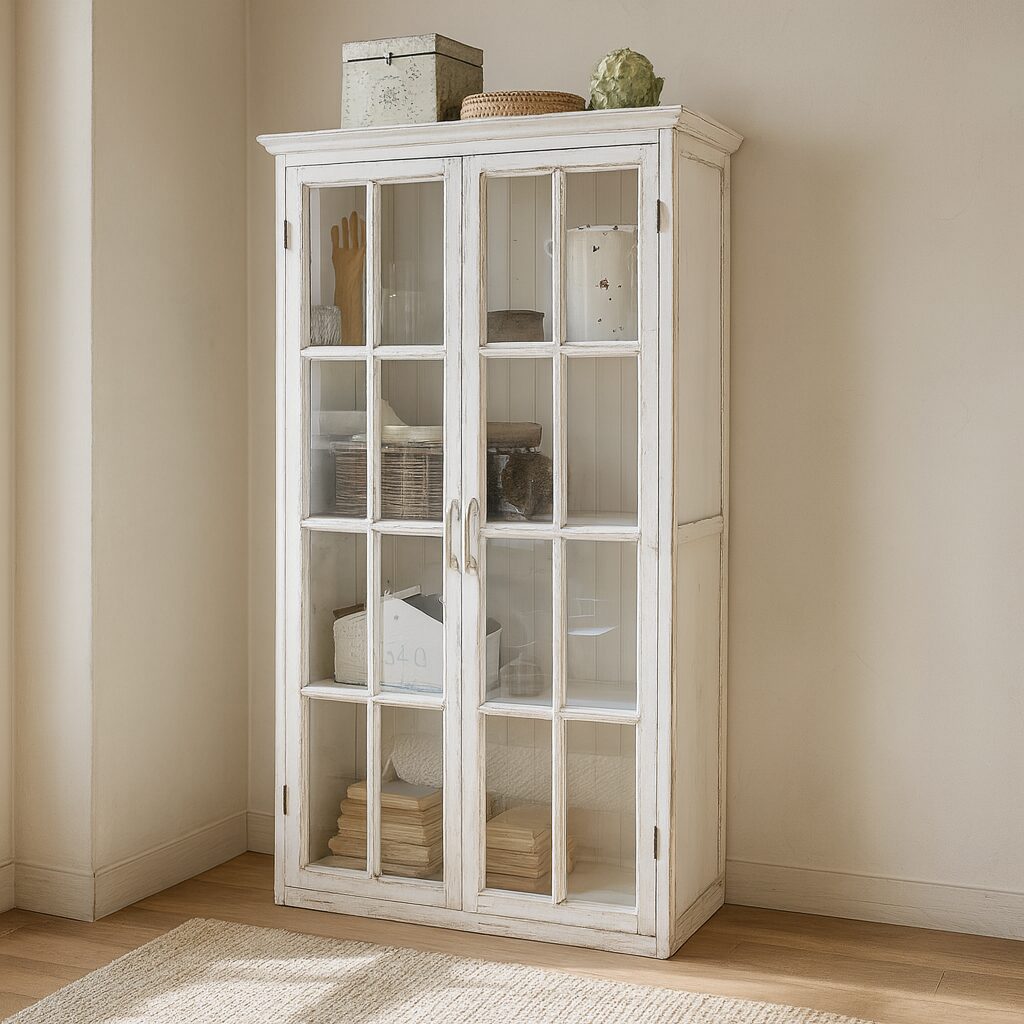 Ein Shabby-Traum aus Holz und Glas wird wahr mit diesem wunderschönen Möbelstück. Das hell lackierte Holz weist authentische Gebrauchsspuren im Lack auf, was dem Schrank einen schönen Vintage-Charakter verleiht. Dieser wird durch die aufwendig gefertigten Kastenfenster stilvoll unterstrichen, die an alte Fabriken oder Scheunen erinnern. Einsätze aus echtem Glas vollenden das Design perfekt. Auf den vier Einlegeböden können viele Gegenstände dekorativ aufbewahrt werden. Da sie durch die Fenster von außen sichtbar sind, kann das schöne Stück eine ähnliche Funktion wie eine klassische Vitrine übernehmen, bietet allerdings mehr Stauraum. Geschirr, Vasen, saisonale Dekoration, Gläser, Körbe oder besondere Textilien finden hier Platz. Das Design passt ideal zu Wohnungen im Shabby Chic oder Landhausstil, sowie zum maritimen Long-Island-Stil. Mit natürlichen Materialien wie Flechtkörben, Laternen, Muscheln, einem Teppich aus Jute oder Stroh und luftigen Leinenvorhängen kann Küsten-Flair erzeugt werden. Romantische Dekoration wie getrocknete Rosen, hübsche Gläser oder nostalgische Blechschilder können zusammen ein charmantes Shabby-Chic-Ambiente kreieren. Der Schrank kann je nach Geschmack und Jahreszeit individuell angepasst werden.