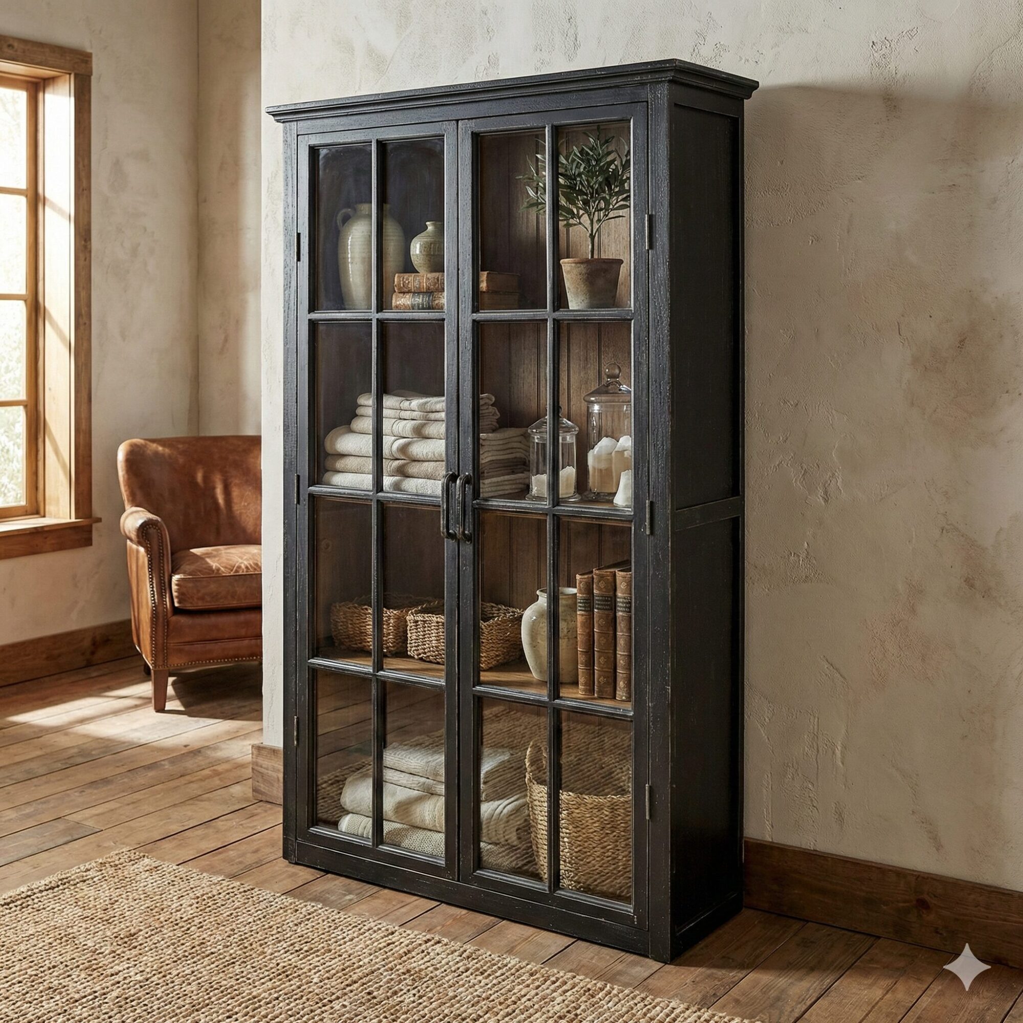 Dieses bezaubernde Möbelstück, gefertigt aus Holz und Glas, ist die Verkörperung eines Shabby-Traums. Die hellen, authentisch abgenutzten Lackdetails verleihen dem Schrank einen einzigartigen Vintage-Charme. Dieser wird durch die kunstvoll hergestellten Kastenfenster, die an die einer alten Fabrik oder Scheune erinnern, stilvoll hervorgehoben. Die Verwendung von echtem Glas rundet das Design ab. Die vier Einlegeböden bieten ausreichend Platz für diverse Deko-Objekte. Da diese durch die Fenster sichtbar sind, kann der Schrank ähnlich wie eine traditionelle Vitrine genutzt werden, bietet jedoch wesentlich mehr Stauraum. Ob schönes Geschirr, Vasen, saisonale Dekoration, Gläser, Körbe oder attraktive Textilien – alles findet hier seinen Platz. Das Design des Schranks harmoniert perfekt mit Wohnungen im Shabby Chic oder Landhaus-Stil, sowie mit dem maritimen Long-Island-Stil. Zur Unterstreichung des Küsten-Flairs können Accessoires aus Naturmaterialien, wie Flechtkörbe, Laternen, Muscheln, ein Teppich aus Jute oder geflochtenem Stroh und leichte Leinenvorhänge, hinzugefügt werden. Für ein romantisches Shabby-Chic-Ambiente können getrocknete Rosen, schöne Gläser oder nostalgische Blechschilder hinzugefügt werden. Der Schrank ist flexibel und passt sich Ihrem persönlichen Geschmack und den wechselnden Jahreszeiten an.