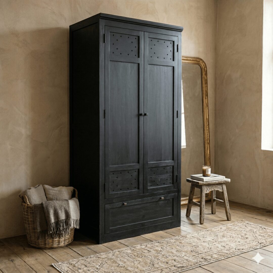 Möbel, die stolz ihre Vergangenheit präsentieren, üben eine besondere Anziehungskraft aus und bereichern das Wohnambiente für Kenner von individuellem Möbeldesign. Dieser Schrank verkörpert genau diese Eigenschaften. Aufgrund seiner imposanten Größe zieht er überall die Blicke auf sich, wobei auch die zahlreichen Details beachtet werden, die seinen besonderen Charme ausmachen. Die authentische Kassettenverarbeitung und die typischen Landhausprofile sind nur der Anfang, denn auch die dekorativen und praktischen Holzaussparungen sorgen für eine gute Belüftung des Innenraums. All das würde ohne die hochwertige Handwerkskunst und die Verwendung von robustem Mangoholz nicht so beeindruckend wirken. Mangoholz zeichnet sich durch seine Härte und Langlebigkeit aus, welche die Möbel unkompliziert im täglichen Gebrauch machen. Das nostalgische Flair wird durch mögliche Gebrauchsspuren noch verstärkt und verleiht dem Schrank eine zusätzliche Ausstrahlung. Neben seinem äußeren Design überzeugt der Schrank auch mit seinem durchdachten Innenleben. Hinter den beiden Türen befinden sich eine Kleiderstange mit Einlegeboden für Kleidung.
