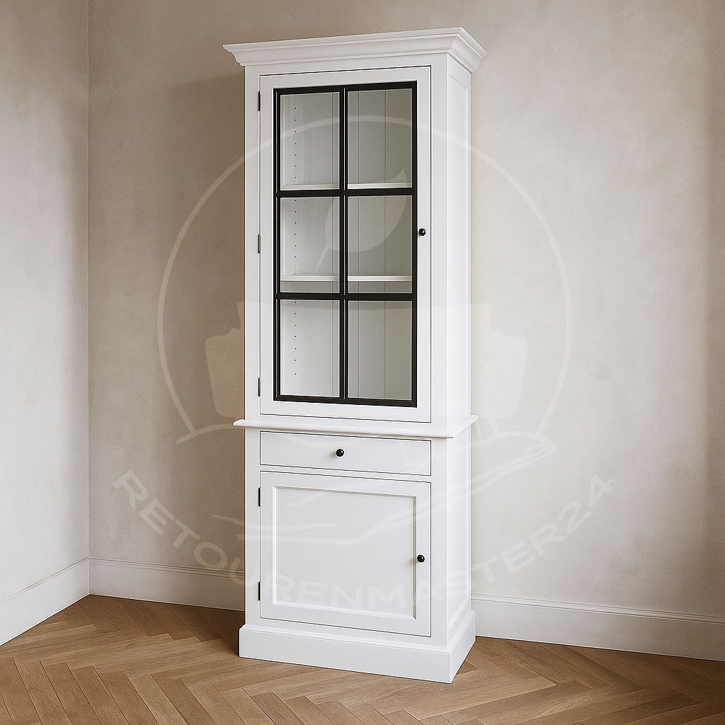 Diese exquisite, qualitativ hochwertige Vitrine im klassischen Landhausstil ist ein echter Hingucker. Sie besteht aus einer Kombination von Mangoholz und Eisen und verfügt über elegante Sprossenfenster, die von Hand bemalt wurden. Mit seiner schlanken Form ist er ideal für kleinere Räume, bietet dabei aber reichlich Stauraum. Dieser stilvolle und zeitlose Schrank ist eine elegante Ergänzung für das Wohnzimmer, in dem Bücher, Geschirr oder Dekoartikel aufbewahrt werden können. Durch die Glasfenster sind Ihre Lieblingsstücke stets sichtbar und bereiten Ihnen täglich Freude. Aber auch im Schlafzimmer macht dieser noble Schrank eine gute Figur und bietet Platz für Bettwäsche und Kissen. Er ist ebenso eine ausgezeichnete Wahl für das Home Office. Mit diesem Schrank fällt es leicht, Ordnung zu halten und gleichzeitig eine charmante Dekoration im Country-Stil zu schaffen.