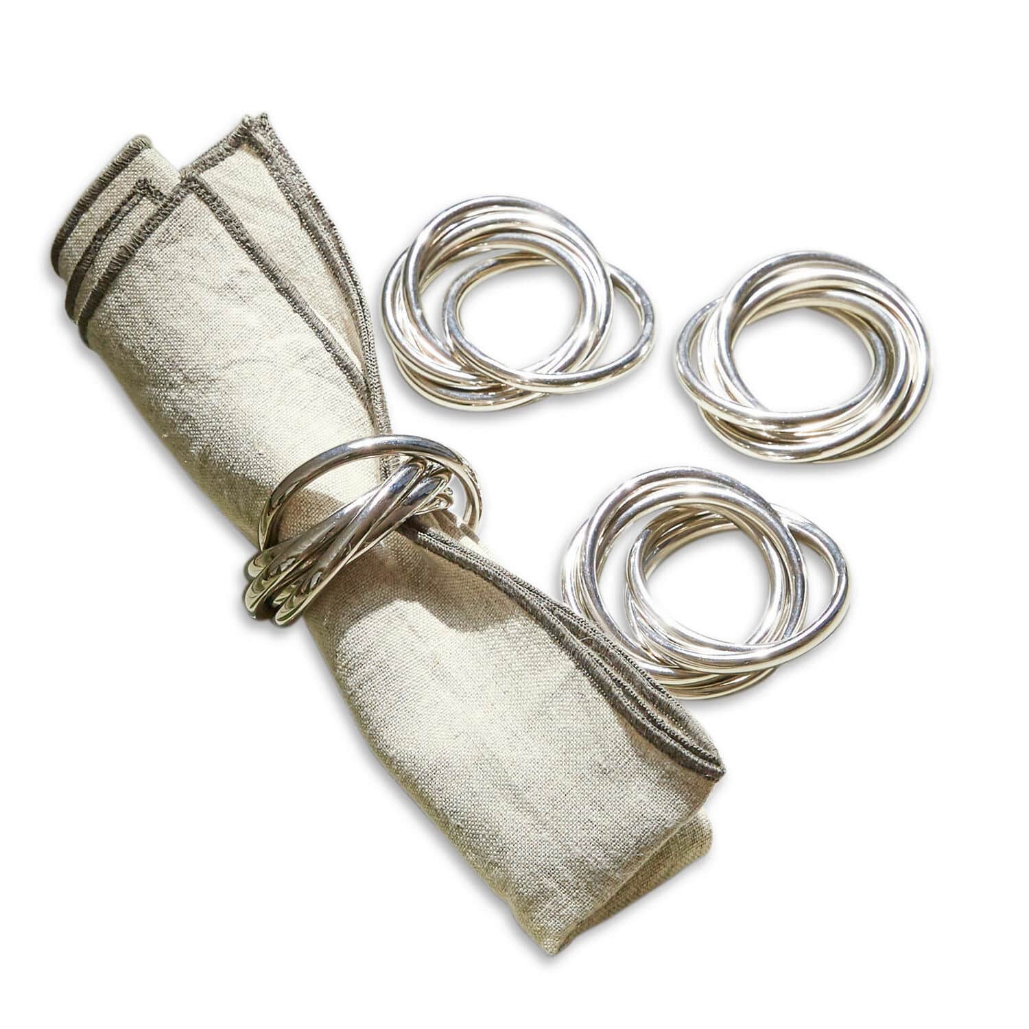 Die Vorbereitung der Tischdekoration ist ein Highlight, egal ob es sich um kleine Zusammenkünfte oder große Feiern handelt. Zugehörige Serviettenringe dürfen dabei nicht fehlen. Sie sind nicht nur unverzichtbarer Teil einer anspruchsvollen Tischkultur, sondern verleihen jeder Tafel einen besonderen Charme. Ihr Aussehen ist klassisch und schlicht, während die Designidee faszinierend ist: Fünf silbern schimmernde Ringe aus qualitativ hochwertigem Messing werden kunstvoll zu einer Einheit verbunden. Dieser Hauch von Raffinesse fängt alle Blicke ein. Mit diesen Ringen können Ihre feinen Stoffservietten auf eine besonders elegante Art präsentiert werden. In einem 4er Set geliefert, werden diese attraktiven Accessoires sicherlich regelmäßig genutzt, da sie sich problemlos jedem Tischambiente anpassen – von rustikal über modern bis hin zu elegant.
