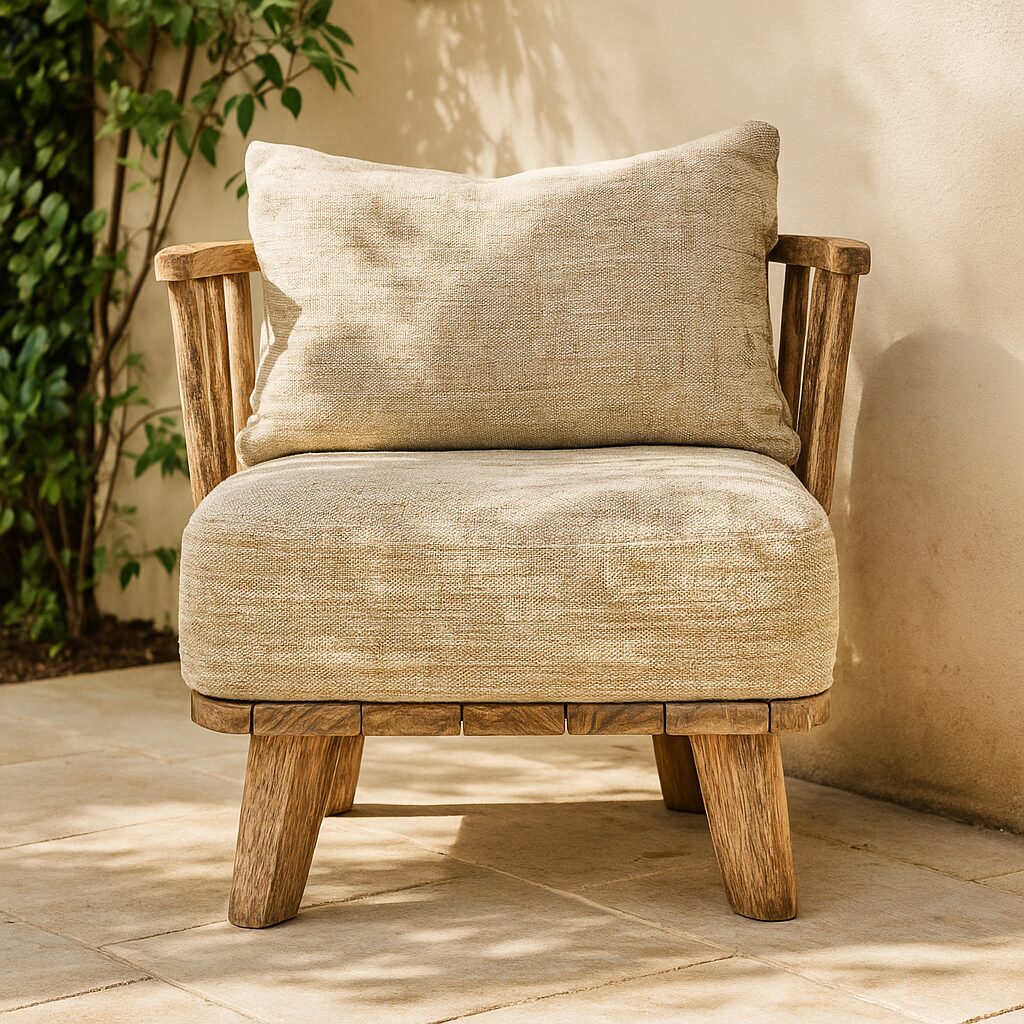 Bereiten Sie sich darauf vor, in Kürze in diesem Stuhl wunderbar entspannte Momente zu genießen! Er bietet erstklassigen Sitzkomfort und sein einzigartiges Design wird Ihre ästhetischen Erwartungen erfüllen. Das Gestell besticht durch seine Stärke und Wetterbeständigkeit. Der Tischler entschied sich für recyceltes Teakholz, das durch den detaillierten Verarbeitungsprozess noch mehr Charakter erhält. Da das edle Hartholz handgefertigt und von hoher Handwerksqualität ist, bietet der Stuhl eine außergewöhnliche Belastbarkeit. Das Teakholz wird durch besonders robuste Rattan-Manau-Stäbe ergänzt, die den elegant geschwungenen Rücken formen. Der Bezugsstoff der Kissen, der nicht wetterfest, aber ausdrucksstark ist, wurde von Hand aus exklusivem Flammgarn gewebt. Die Mischung verschiedener Garne verleiht ihm eine interessante Oberflächenstruktur und den eleganten Melange-Effekt. Zusätzlich zum Stuhl können wir Ihnen auch eine elegante Chaiselongue (21733) im gleichen Design anbieten. Bei beiden Möbelstücken verfügen die Kissen über einen Reißverschluss und können bei Bedarf entfernt und gereinigt werden.
