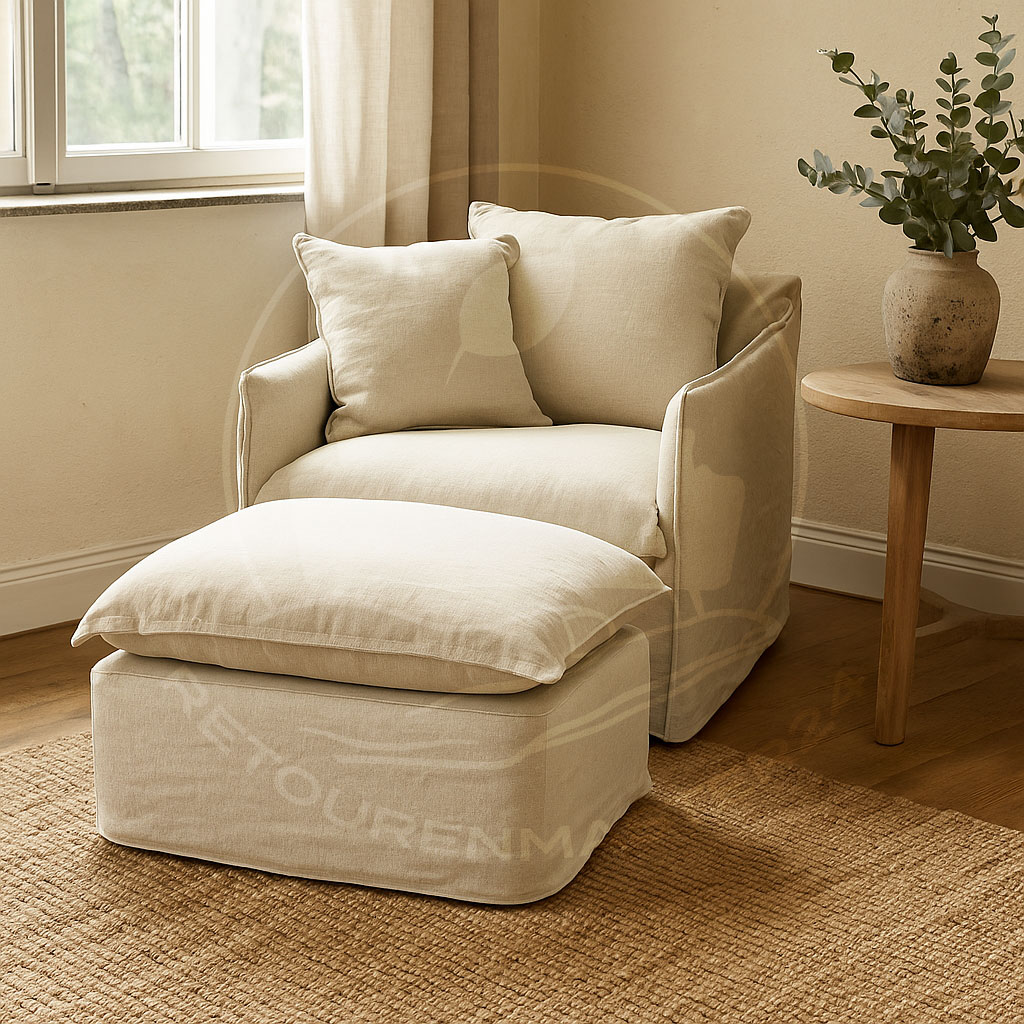 Dieses entspannte Duo aus Sessel und Hocker bietet Ihnen eine traumhafte Bequemlichkeit und eine stilvolle Ausstrahlung. Es ist darauf ausgelegt, Ihnen nach einem langen Arbeitstag nahezu jeden Wunsch zu erfüllen. Der Sessel und der Hocker wissen genau, wie sie Ihnen ein gemütliches Ambiente schaffen können. Sie verfügen über eine extrem bequeme Polsterung, die eine perfekte Kombination aus traditionellem Federkern und hochwertigem Schaumstoff darstellt. Zwei große Sitzkissen und zwei kleinere Dekokissen, teilweise mit echten Entenfedern gefüllt, sorgen für eine angenehme Weichheit und Stabilität. Der Bezug aus einem strapazierfähigen Baumwoll-Leinen-Gemisch ist hautfreundlich und eignet sich für jede Jahreszeit, ob kalt oder warm. Kurz gesagt, dieser Sessel mit Hocker wird zu Ihrem neuen Rückzugsort, in den Sie sich jeden Abend mit Vergnügen hineinfallen lassen und in kürzester Zeit tief entspannen können. Insbesondere wenn Sie Ihre Füße auf den Hocker legen, was jeder Gesundheitstrainer Ihnen in stressigen Zeiten empfehlen würde. Das Hochlegen der Füße entlastet nämlich Beine und Rücken und trägt zu einem besonderen Erholungseffekt bei. Also, wann beginnen Sie Ihre neue Entspannungsroutine mit diesem Sessel und Hocker?