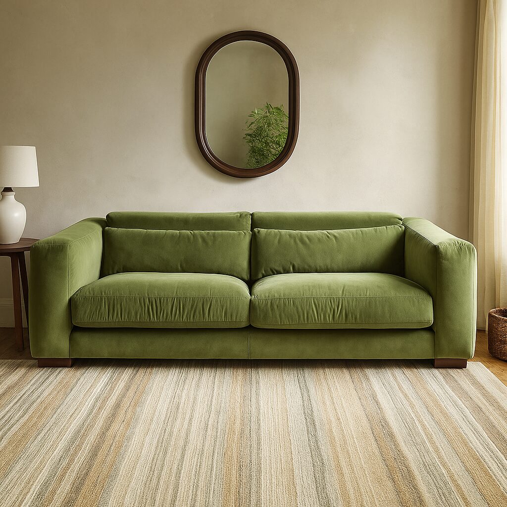 Beschreibung Grün, die Farbe der Natur und des Lebens, strahlt in einem sanften Olivton Ruhe aus und fördert das Gleichgewicht von Körper und Seele. Angesichts dieser Assoziationen, stellen wir Ihnen die Frage: Könnte es eine passendere Farbe für ein Sofa geben? Ein Sofa, das nach einem anstrengenden Tag zu vollkommener Entspannung einlädt. Aber nicht nur der warme Olivton trägt zu dieser beruhigenden Wirkung bei, sondern auch der weiche Polyestersamtbezug, der zum gemütlichen Einkuscheln einlädt. Mit diesem Sofa holen Sie sich eine Wohlfühloase ins Haus, auf die Sie nicht mehr verzichten wollen. Dank seiner großzügigen Sitzbreite bietet das Sofa genug Platz, um sich auszustrecken oder drei Personen bequem unterzubringen. Die hochwertige Polsterung bietet die ideale Mischung aus Weichheit und Festigkeit und wird durch zwei längliche Kuschelkissen und dicke Armlehnen ergänzt, um den Entspannungskomfort zu maximieren. Das sorgfältig handgefertigte Kiefernholzgestell sorgt für Stabilität und eine lange Lebensdauer. Tipp: Ergänzen Sie das grüne Sofa mit passenden Accessoires wie Dekokissen, Vasen und mehr, um den harmonischen Look Ihres Wohnraums zu vervollständigen.