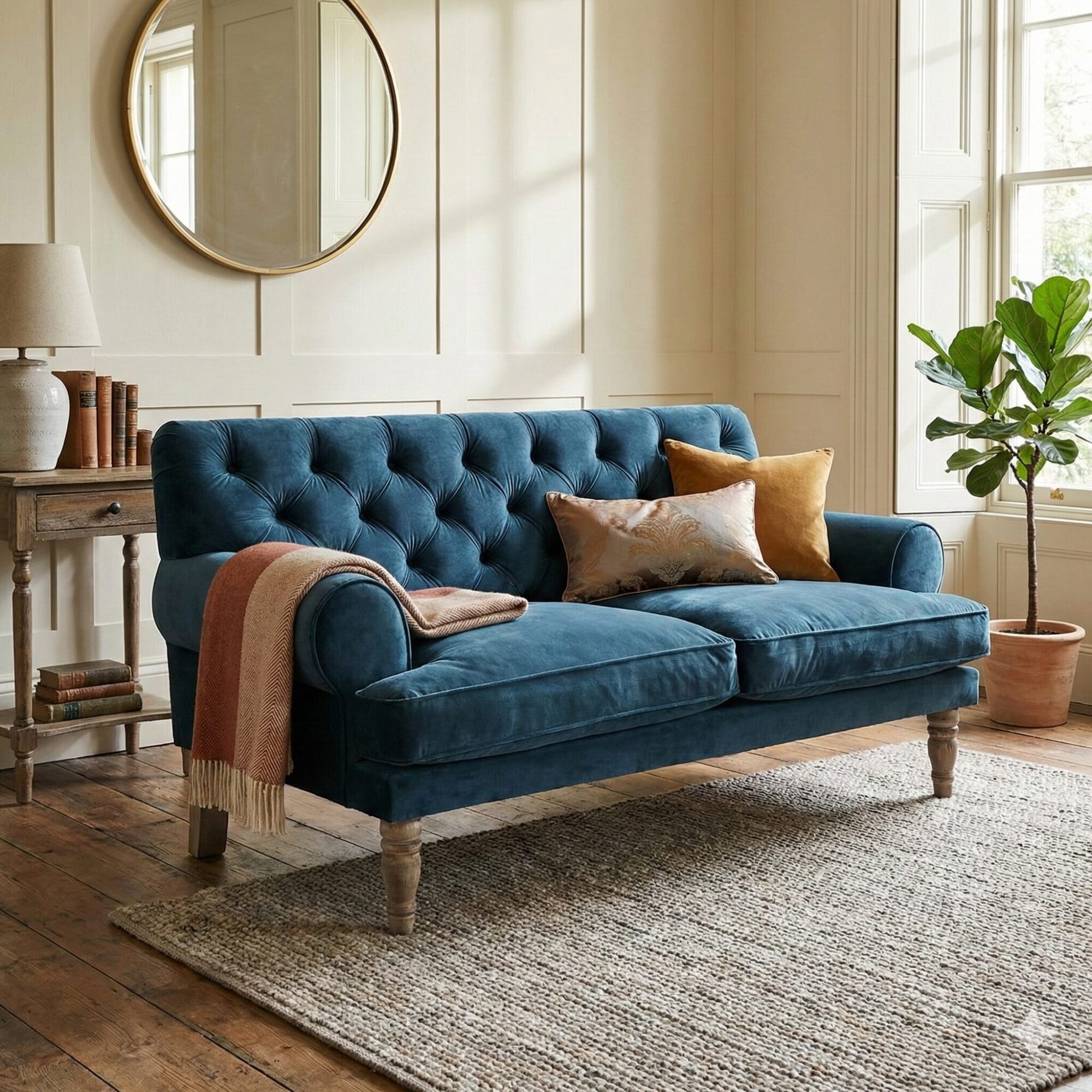 Einige Möbelstücke sind besonders bemerkenswert. Das erkennt man auf den ersten Blick – und manchmal kann man es sogar spüren. Das kunstvolle Sofa mit der charakteristischen Chesterfield-Steppung und der wunderbar weichen Samttextur gehört zweifellos zu den außergewöhnlichen Schmuckstücken. Der elegante Blickfang strahlt durch sein klares Design mit komfortabler Polsterung ein Gefühl von unbeschwerten Luxus aus. Es beeindruckt durch seine klassisch schöne Form und bietet Platz für zwei bis drei Personen. Ob im Wohnzimmer, Arbeitszimmer oder Gesellschaftsraum, es macht überall eine gute Figur. Das Gestell besteht aus Mangoholz, was eine hohe Haltbarkeit und einfache Pflege gewährleistet. Zudem sind die Sitzkissenbezüge abnehmbar. Ob beim Lesen von Arthur Conan Doyle oder Baudelaire bei Kerzenschein oder beim Lachen und Plaudern mit Freunden und Familie – Sie werden viele schöne Stunden mit diesem eleganten Möbelstück verbringen.