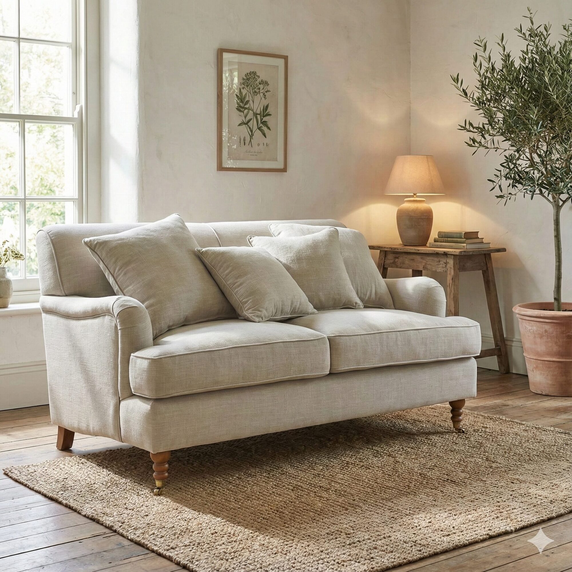 Dieses Möbelstück, bekannt unter vielen Namen wie Couch, Kanapee, Diwan oder Sofa, hat sich über die Jahrhunderte hinweg in verschiedenen Stilrichtungen entwickelt und bleibt nach wie vor beliebt. Dieses spezielle Sofa-Modell wurde für diejenigen entworfen, die sowohl modernes Design als auch erstklassigen Komfort schätzen. Die dezente Farbgebung des hochwertigen Leinenbezuges fügt sich nahtlos in das schlichte, geradlinige Design ein, welches durch bequeme Sitzkissen und zwei Zierkissen aufgelockert wird. Die kunstvoll gedrechselten Füße verweisen liebevoll auf historische Designs. Dieses Sofa, das seine Verbindung zu den berühmten Design-Klassikern der italienischen Schule nicht verbergen kann, bietet nicht nur ein elegantes Design, sondern dank der weichen Schaumstoffpolsterung auch luxuriösen Komfort. Egal ob Sie aufrecht sitzen, sich entspannt zurücklehnen oder gemütlich zu zweit kuscheln möchten, dieser 2-Sitzer ist vielseitig einsetzbar. Der Leinenbezug und der solide Kiefernholzrahmen sorgen für Alltagstauglichkeit. Die Kissen sind mit Reißverschlüssen versehen, sodass der Bezug bei Bedarf abgenommen werden kann.