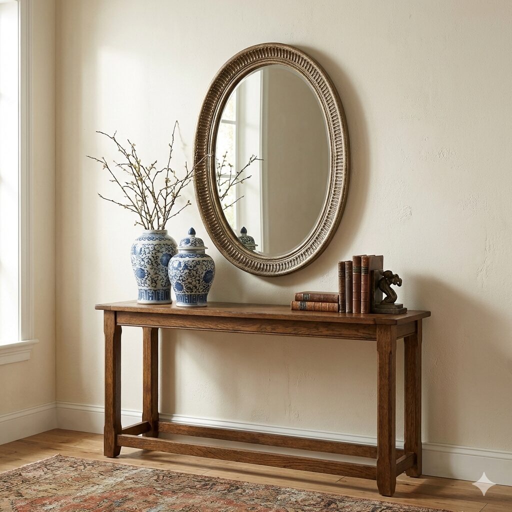 Spieglein, Spieglein an der Wand …. Dieser ovale Wandspiegel könnte die Hauptrolle in einem Märchen spielen. So anmutig, wertvoll und authentisch präsentiert er sich – als hätte man ihn auf einem Flohmarkt entdeckt. Das liegt vor allem an seinem dezent verzierten Holzrahmen, der von Hand liebevoll mit einem antik-goldenen Finish veredelt wurde. Sein Look fügt sich ideal in ein Vintage-Ambiente ein, in modernen Wohnkonzepten setzt der Spiegel interessante Akzente. Erleben Sie die Wirkung dieses besonderen Stücks – sei es im Eingangsbereich, im Schlafzimmer oder im Badezimmer.