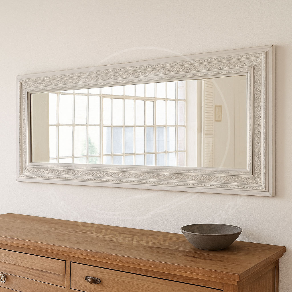 Es gibt Wohnaccessoires, die man auf den ersten Blick liebt. Und da sie auch über lange Zeit hinweg ihre einzigartige Faszination behalten, erwirbt man so Lebenspartner. Oder zumindest für einen langen, langen Abschnitt des Lebens. Dies könnte Ihnen passieren, wenn Sie diesen Spiegel in Ihr Zuhause holen und er an einem passenden Ort Ihren Wohnraum mit seinem beeindruckenden Erscheinungsbild bereichert. Nicht nur Sie, sondern auch Ihre Gäste werden immer wieder die kunstvolle Schnitzarbeit am Spiegelrahmen bewundern, wobei besonders die schmuckvolle Blende im Mittelpunkt des Interesses stehen wird, die an edle Klöppelspitze erinnert. Ein filigranes Kunstwerk, das liebevoll von Hand aus dem harten Edelholz des Paulowniabaums gefertigt wurde, das bevorzugt für hochwertige Möbel und Musikinstrumente verwendet wird. Die Raumatmosphäre des Spiegels wird durch das Finish in Antik-Weiß unterstützt, das den nostalgischen Charakter unterstreicht. Dank der 4 Haken auf der Rückseite können Sie entscheiden, ob Sie den Spiegel hochkant oder quer aufhängen möchten. Über einer breiten Kommode sorgt er in waagerechter Position für interessante Raumeffekte, während er im Flur oder Schlafzimmer in senkrechter Position die Möglichkeit bietet, sich und Ihr Outfit von Kopf bis Fuß zu begutachten.