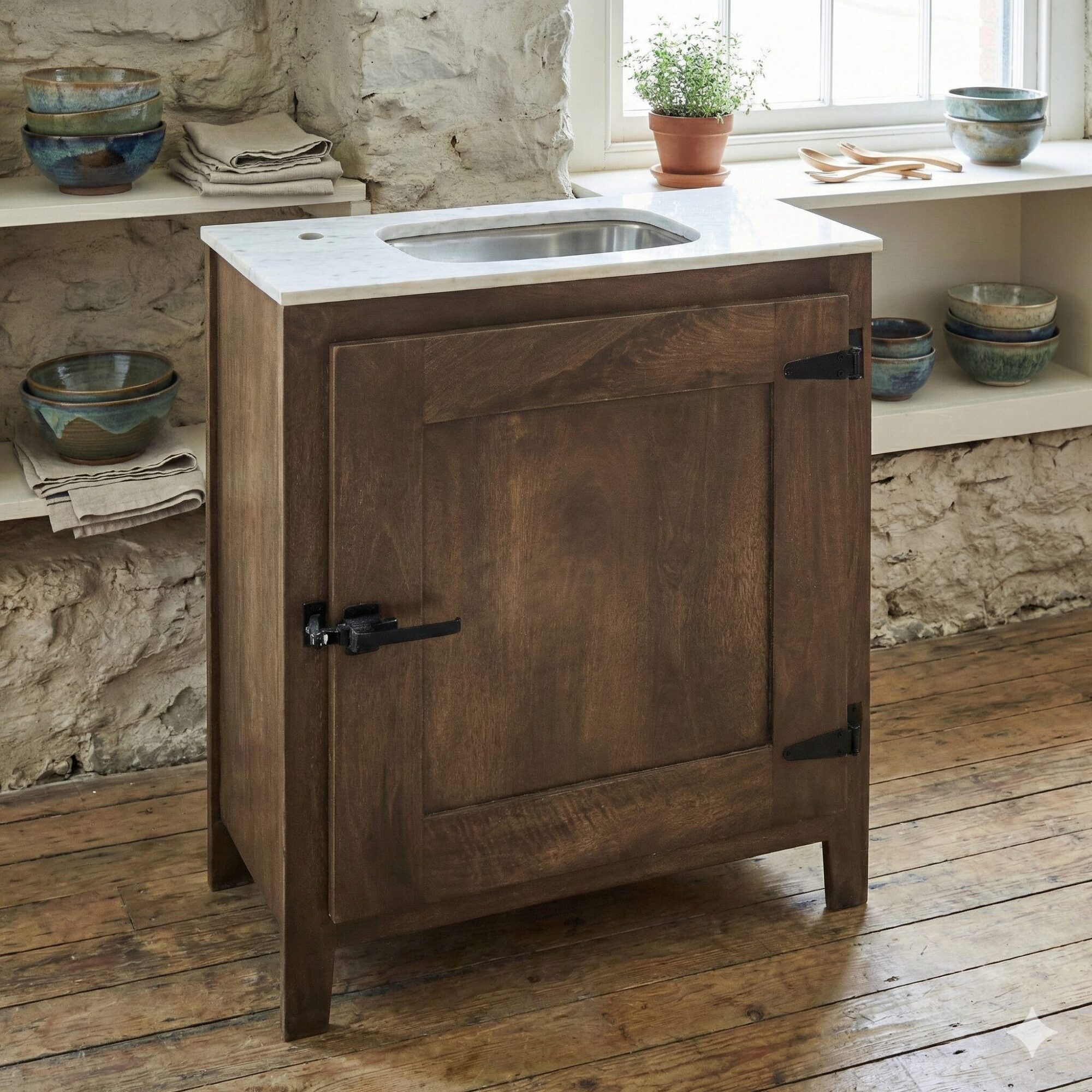 Luxus pur mit nostalgischer Note. Dieser hochwertige Spülenschrank bezaubert mit seiner eleganten Optik und hoher Qualität. Hergestellt aus dunklem Mangoholz, bildet er eine reizvolle Kombination mit der Platte aus hellem Marmor, die sich angenehm kühl und glatt anfühlt. Im Inneren verfügt der Schrank über ein geräumiges Regal mit festem Boden, das viel Stauraum bietet, z. B. für Töpfe oder Küchenhandtücher. Die glänzende Edelstahlspüle ist bereits enthalten, die Armatur jedoch nicht. Dank seiner kompakten Maße eignet sich das Design auch ideal für kleine Küchen. Mit diesem wunderschönen Möbelstück macht das Kochen in der Küche noch mehr Spaß und das Zubereiten köstlicher Speisen für Sie und Ihre Lieben wird zum Vergnügen. Eine exzellente Wahl für Ihre stilvoll eingerichtete Küche.