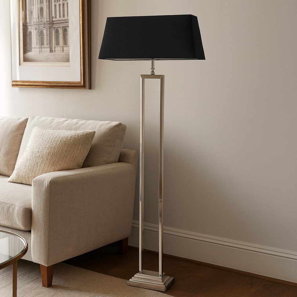 Mit einer exquisiten Eleganz begeistert diese Stehlampe aus Stahl und Aluminium. Ihr glänzendes Design verbindet kantige Linien mit harmonischer Formgebung und strahlt einen luxuriösen Glanz aus. Diese funktionalen Lichtquelle dient als einzigartiges Dekorationsstück, das sich nahtlos in jeden Wohnbereich einfügt. Der quadratische Stoffschirm aus Baumwolle ist sowohl nach unten als auch nach oben offen, was eine großzügige Verteilung des Lichts ermöglicht. Selbst im ausgeschalteten Zustand erhöht diese Stehlampe durch ihr geschmackvolles Design den ästhetischen Wert jedes Interieurs. Trotz ihrer zierlichen Gestalt steht die Lampe sehr stabil, da bei ihrer cleveren Konstruktion ausschließlich robuste und hochwertige Metalle verwendet wurden.