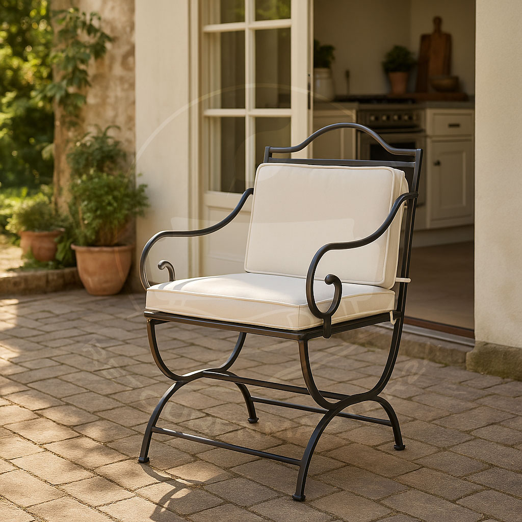 Erleben Sie den Charme des Mittelmeers durch diesen Finca-Stil Stuhl! Die Eisenbänder, die im Carrée-Design verarbeitet sind, verleihen dem Stuhl sowohl eine robuste Stabilität als auch eine filigrane Eleganz. Die dynamisch geformten Armlehnen und der Abschluss der Rückenlehne ergänzen das Design perfekt. Die charakteristische Konstruktion der Stuhlbeine sorgt für außerordentliche Standfestigkeit. Zudem gewährleistet der Stuhl durch die dicken Schaumstoffpolster mit einem strapazierfähigen Bezug aus 100% Baumwolle höchsten Sitzkomfort. Dieser Stuhl ist leider ohne Sitzauflagen!