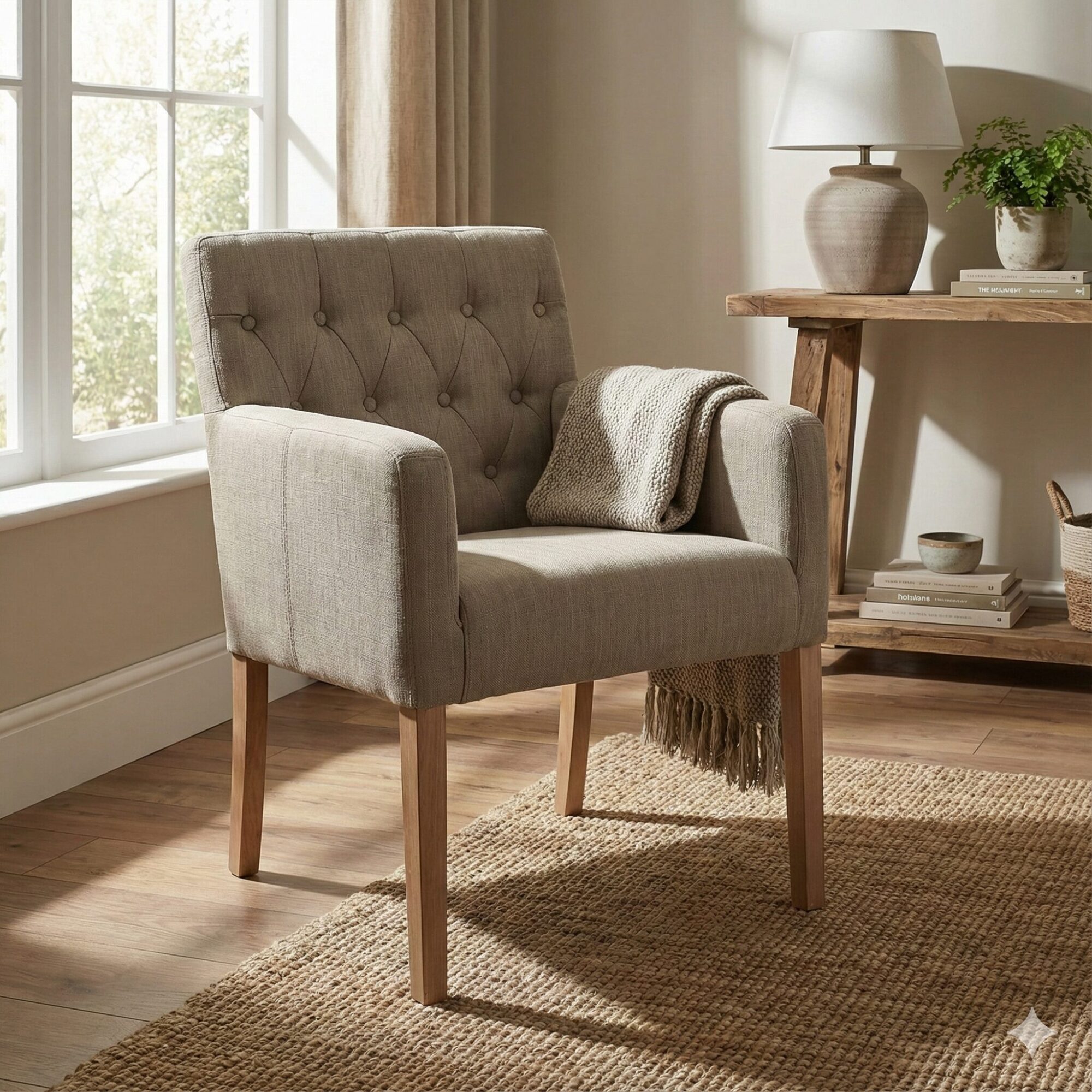 Dieser stilvolle Stuhl, der vollständig aus authentischem Holz hergestellt ist, ist meisterhaft gepolstert und mit einer Kombination aus Rayon und Leinen überzogen. Die Chesterfield-Stil Knopfsteppung und die elegant geformten Holzbeine sind besonders auffällige Merkmale. Obwohl er weniger Raum einnimmt als ein Sessel, bietet er einen vergleichbaren Komfort.