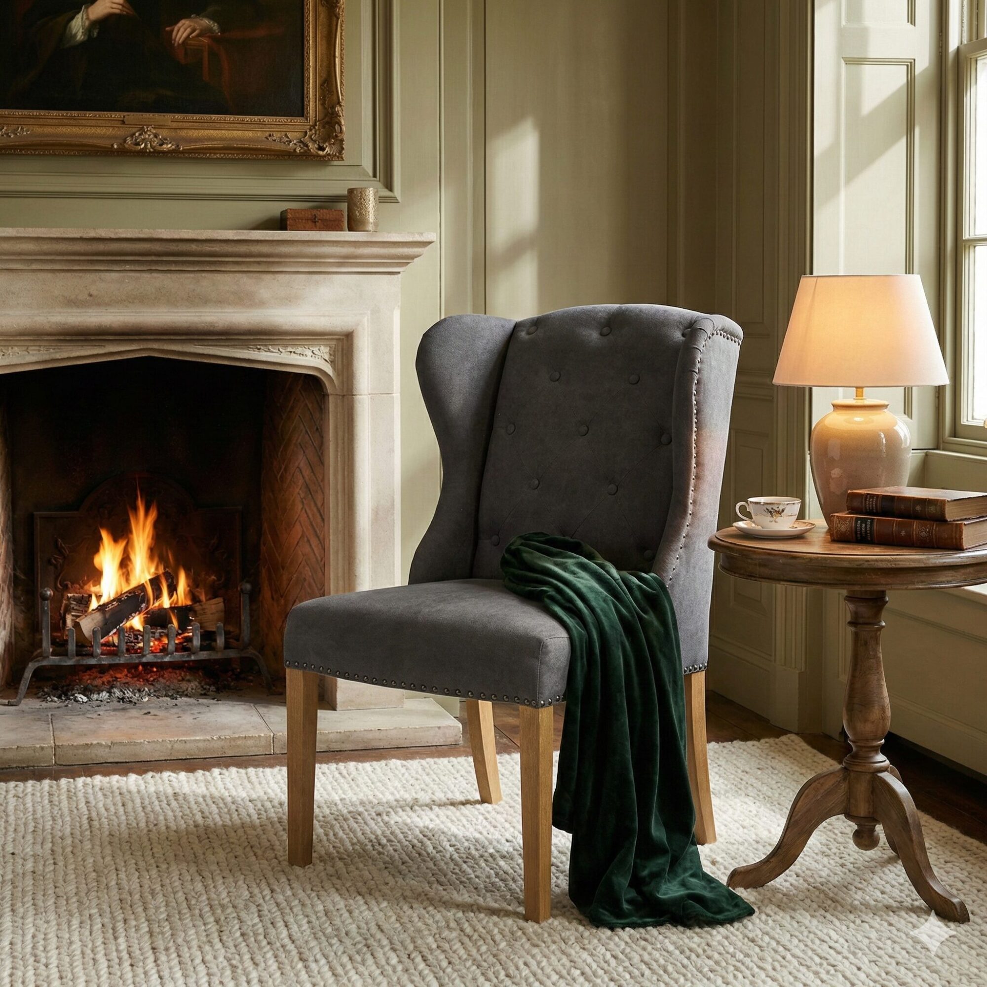 Echte Innovationen bleiben immer im Trend, so auch der traditionelle Ohrenbackensessel. Im Gegensatz zu seinen historischen Vorgängern, die einst in Schlössern und vornehmen Landsitzen vor Kaminwärme und kalter Zugluft schützten, haben sich die modernen Versionen mit kleinen Anpassungen an unsere aktuellen Bedürfnisse angepasst. Dieser Stuhl bietet nicht nur ein luxuriöses Sitzgefühl, sondern hat auch die ideale Höhe, um am Esstisch positioniert zu werden. Die Bequemlichkeit der neuen Stühle wird Ihnen auffallen, wenn Ihre Gäste ständig die Zeit vergessen und auch spät in der Nacht noch gerne an Ihrem Tisch sitzen und plaudern. Der exquisite Sitzkomfort wird durch die hochwertige Schaumstoffpolsterung und die klassischen Sprungfedern gewährleistet, während das handgefertigte Gestell aus feinem Buchenholz dem Stuhl seine herausragende Stabilität und Belastbarkeit verleiht. Optisch folgt der Stuhl seinen historischen Vorbildern, von der charakteristischen Form bis zum weichen Polyestersamt-Bezug und den sorgfältig handgefertigten Knöpfen und Nieten. Überraschenderweise und zur Freude vieler, lassen sich Stühle wie dieser hier erstaunlich vielseitig kombinieren. Sie harmonieren sowohl mit rustikalen, dunklen Holztischen, wie sie in typischen Landhausküchen zu finden sind, als auch mit eleganteren Tischmodellen.
