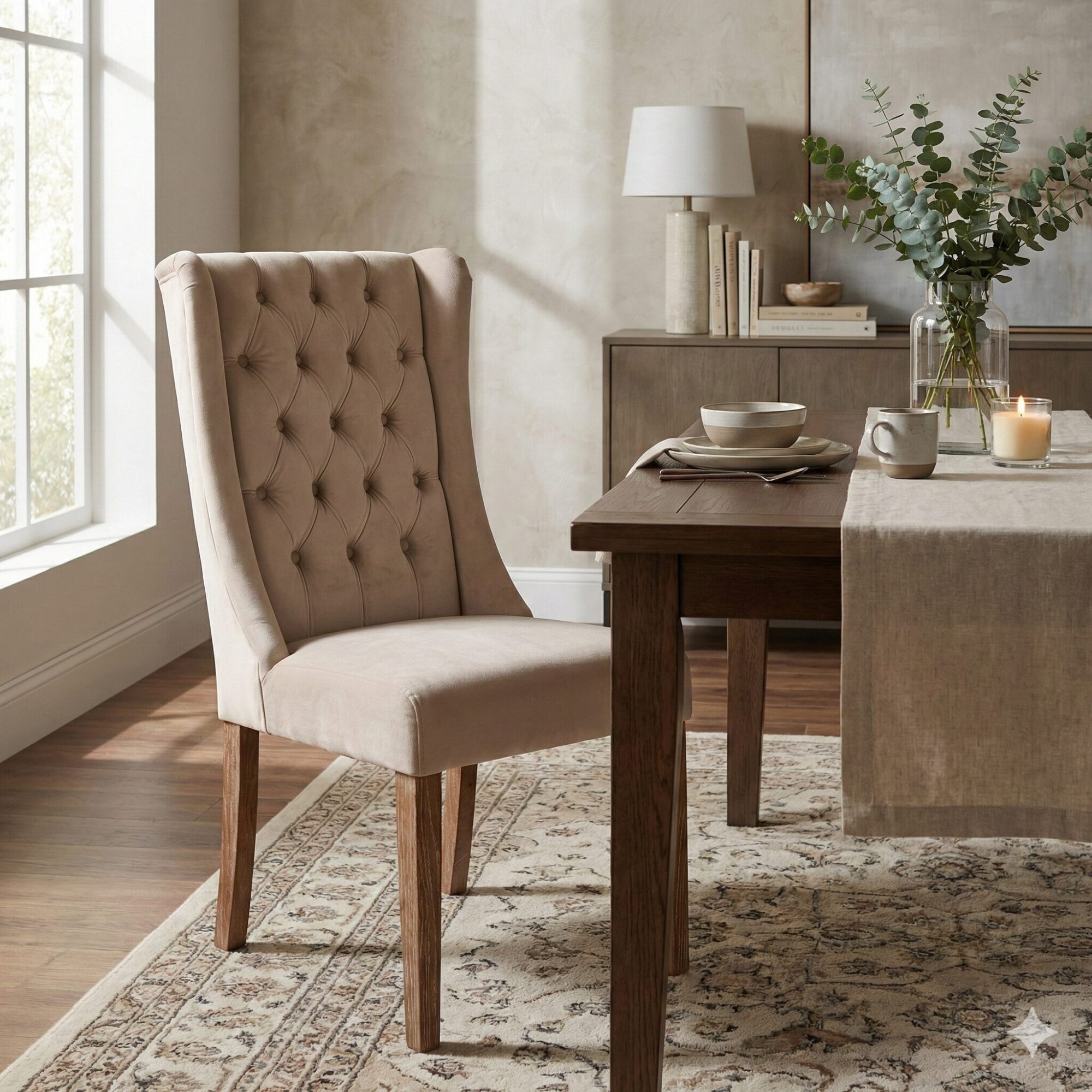 Dieser wunderschöne Stuhl verleiht jedem Raum eine besondere Eleganz und wird schnell zum Lieblingsstück. Das handgefertigte Design beeindruckt mit einem hochwertigen Bezug und der edlen Chesterfield-Steppung, die dem Stuhl zusätzlichen Charakter verleiht. Sein Gestell aus kostbarem Eschenholz im Antik-Finish harmoniert perfekt mit den geschwungenen Linien und der sanften Farbgebung, die das stilvolle Design abrunden. Dank der bequemen Polsterung bietet er zudem höchsten Komfort. Der Stuhl passt hervorragend zu Landhaus-Stil und Shabby-Chic und macht sowohl am Arbeitstisch, Schminktisch oder Esstisch eine gute Figur – ein stilvolles Möbelstück, das zum Verweilen einlädt.