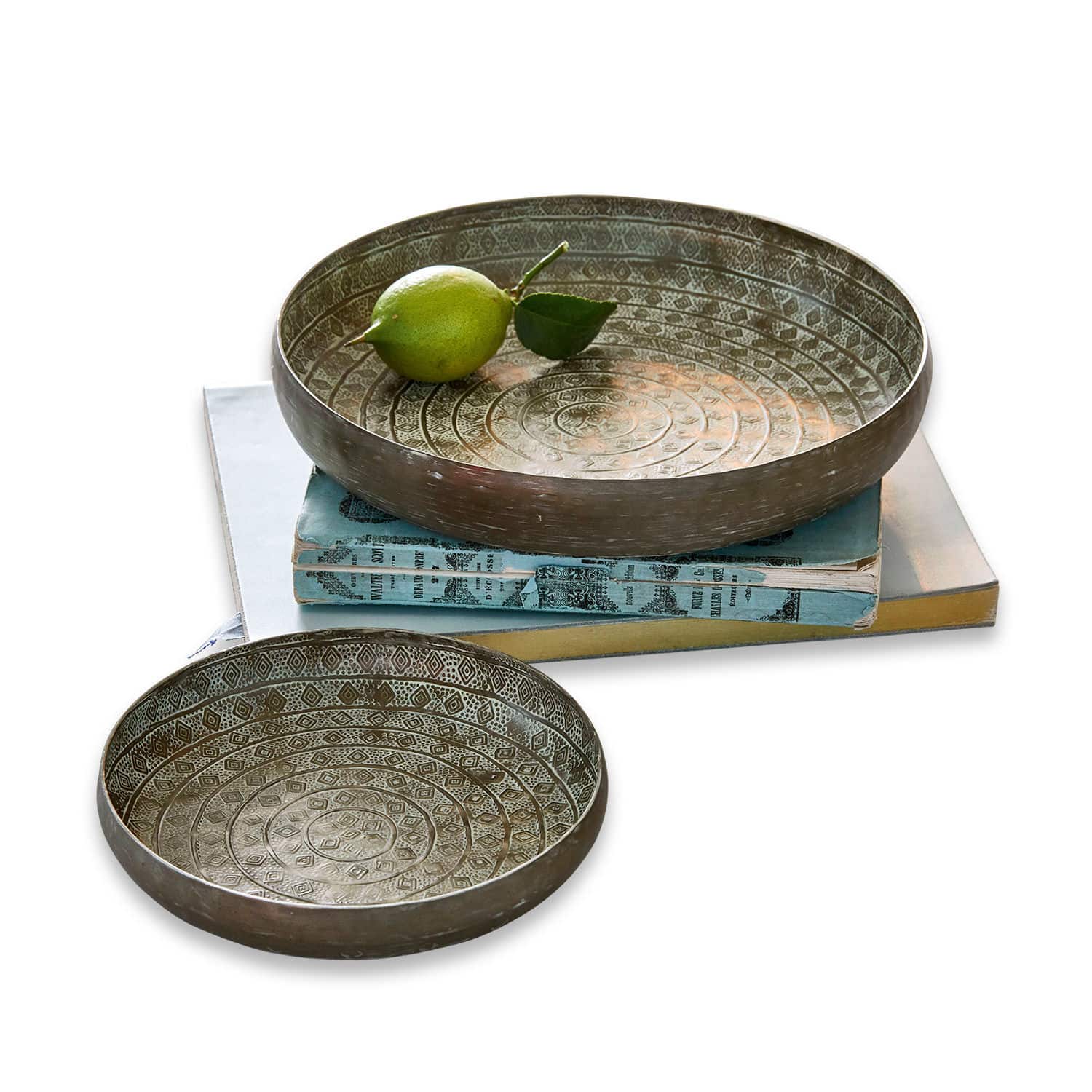 Manche Dinge erstrahlen in einem gealterten Zustand einfach in voller Pracht. So auch dieses exquisite Tablett-Set, gefertigt aus erstklassigem Aluminium. Mit einem Antik-Finish in Bronze veredelt, reflektieren sie auf beeindruckende Art und Weise die Zeichen der Zeit. Ihre dekorative Struktur verleiht dem Design eine stilvolle Dynamik und betont den einzigartigen Charme dieser Accessoires. Ein Hauch von orientalischem Glanz fügt sich somit in Ihr Wohnambiente ein. Mit ihrer runden Form und in zwei unterschiedlichen Größen bieten die Tabletts eine Fülle von Anwendungsmöglichkeiten: Sie dienen beispielsweise als elegante Servierplatten für Wein und Sekt bei Ihren Gästen. Sie können aber auch als Bühne für eine Auswahl an Windlichtern dienen – die Kombination aus Glas, Metallic-Schimmer und Kerzenlicht ist schlichtweg betörend. Je nach Jahreszeit und Stimmung können mit den Tabletts einzigartige Arrangements gestaltet werden. Sie passen besonders gut zum Shabby-Chic oder Landhaus-Stil.