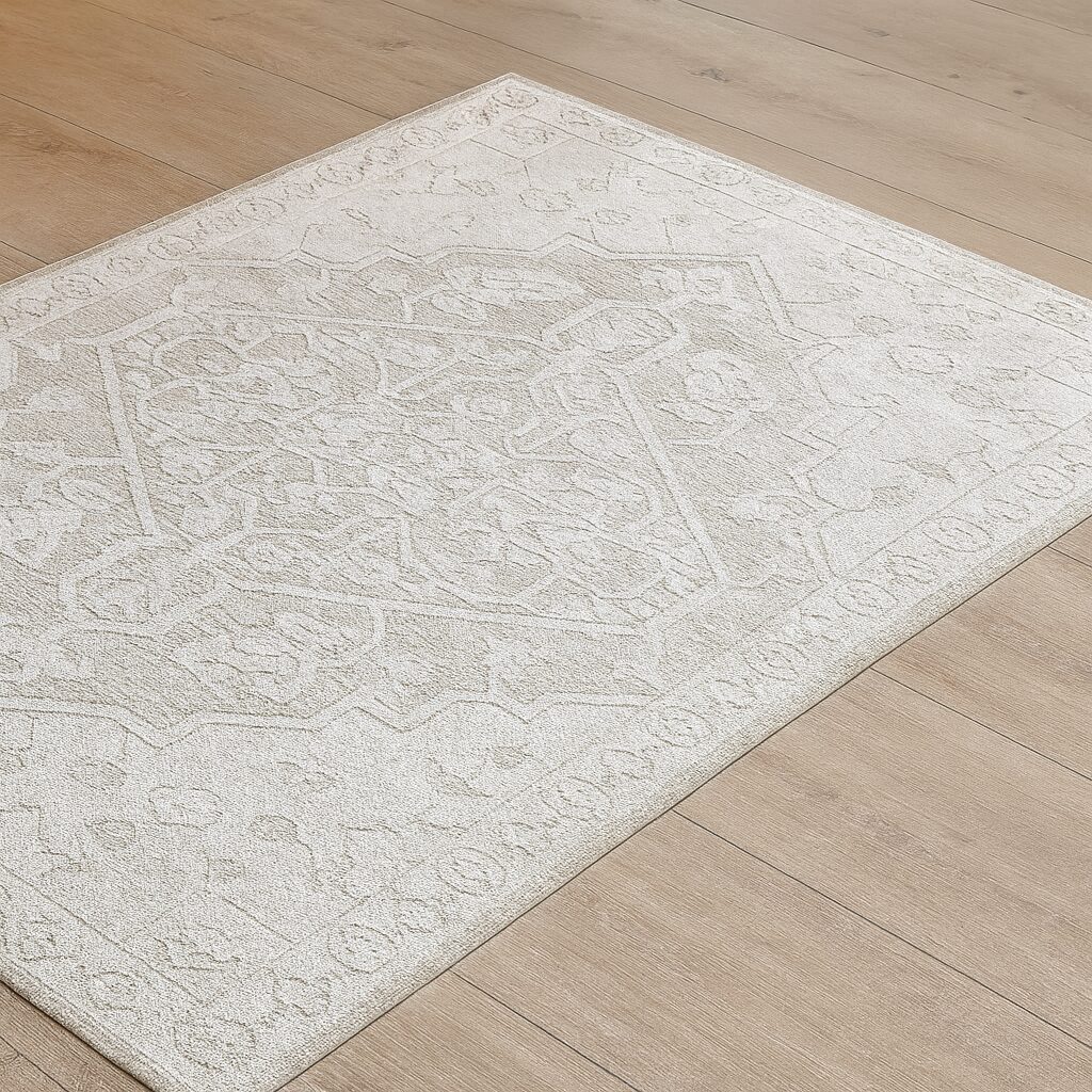 Dieser prächtige Teppich, mit seinem subtilen und sanften Design, verzaubert Ihre Räume und schafft eine herrliche Atmosphäre. Seine elegante Einfachheit macht ihn zu einem echten Blickfang. Die sanfte Baumwollunterseite bietet zusätzlichen Komfort und verleiht dem Teppich eine besondere Note. Dieser Teppich ist der perfekte Begleiter, der Ihnen zu Diensten steht, um Ihr Heim in einen bezaubernden und fesselnden Ort zu verwandeln.