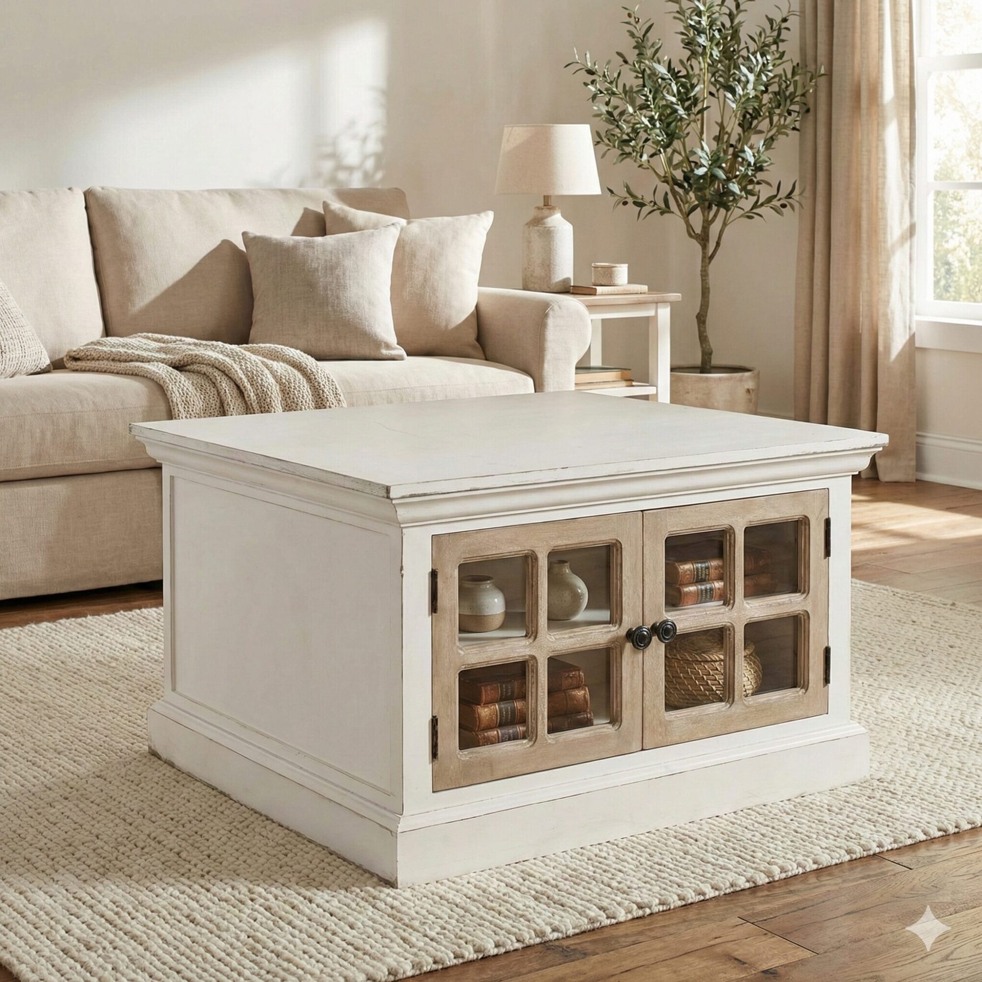 Dieser Couchtisch ist ein Möbelstück mit Ausstrahlung, das Design und Nutzen auf eine einzigartige Weise miteinander verbindet. Seine klaren Konturen harmonieren mit liebevollen Landhausstil-Elementen. Eine Seite des Tisches bietet mit zwei geräumigen Schubladen Platz für alle notwendigen Dinge, während auf der gegenüberliegenden Seite durch die Glastüren attraktive Accessoires zur Schau gestellt werden können. Die Kombination aus antikweißer Lackierung und den dezent gekälkten Holzfronten erzeugt ein feines Gleichgewicht zwischen rustikalem Charme und behaglicher Eleganz. Dieser Tisch ist nicht nur funktional, sondern auch ein echter Hingucker – vom Morgenkaffee bis zum abendlichen Entspannen.