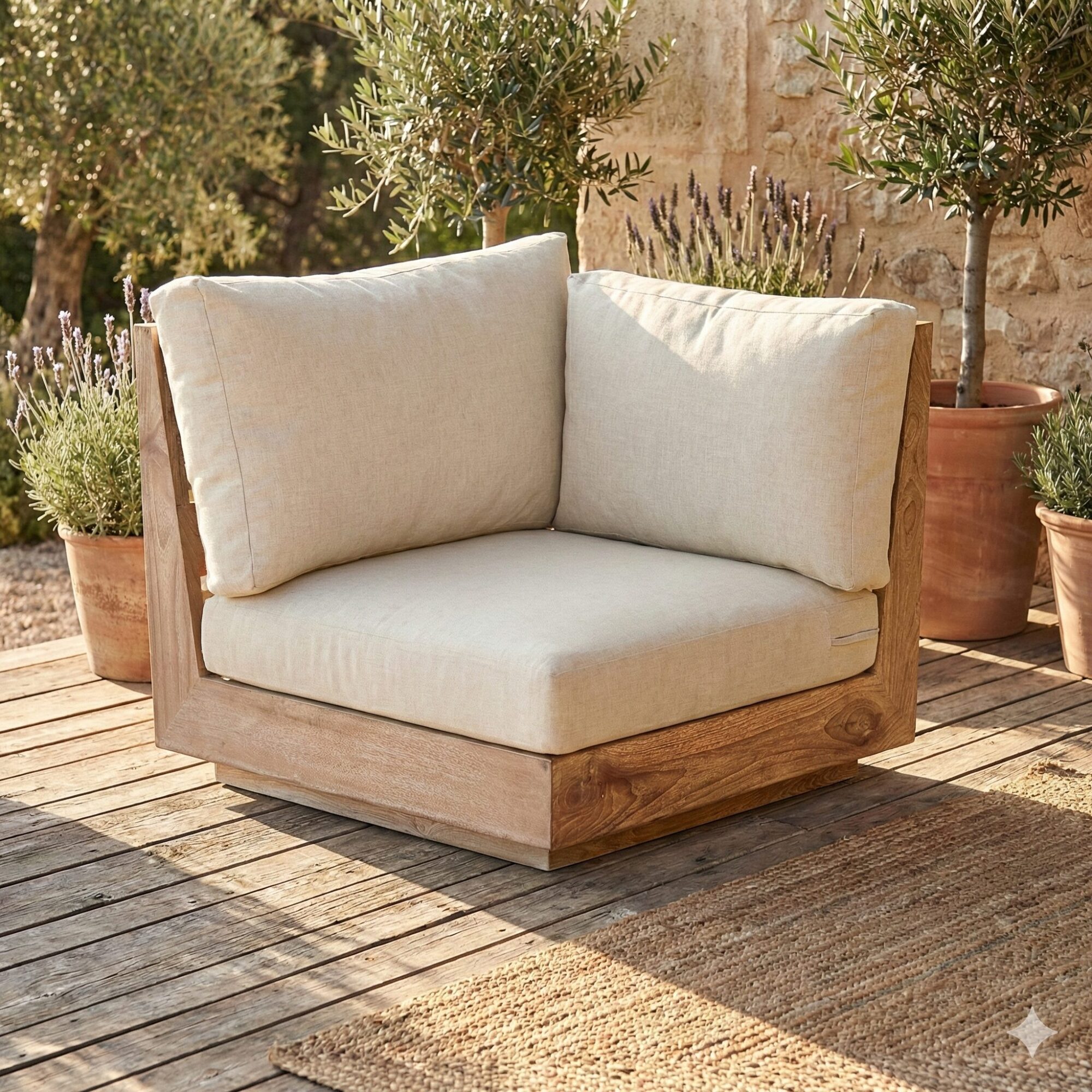 Geben Sie Ihrer Terrasse oder Ihrem Garten einen Hauch von Eleganz mit diesem stilvollen Eckelement, das alleine oder in Kombination mit anderen Modulen Ihrer Außenlounge einen luxuriösen Touch verleiht. Dieses aus Teakholz hergestellte Element präsentiert sich mit einem raffinierten White-Washed-Finish, das die Holzmaserung hervorhebt und einen natürlichen Zauber versprüht. Die strapazierfähigen, wetterbeständigen Kissenhüllen garantieren Bequemlichkeit und Langlebigkeit für zahlreiche entspannte Stunden im Freien. Dieses Eckelement ist mehr als nur ein Möbelstück – es ist eine Aufwertung Ihrer Lebensqualität, die sowohl die Optik als auch den Komfort Ihres Außenbereichs steigert. Mit den schnell trocknenden Olefin-Hüllen ergänzt, bietet es sich als ideales Sitzmöbel für Terrasse und Balkon an.