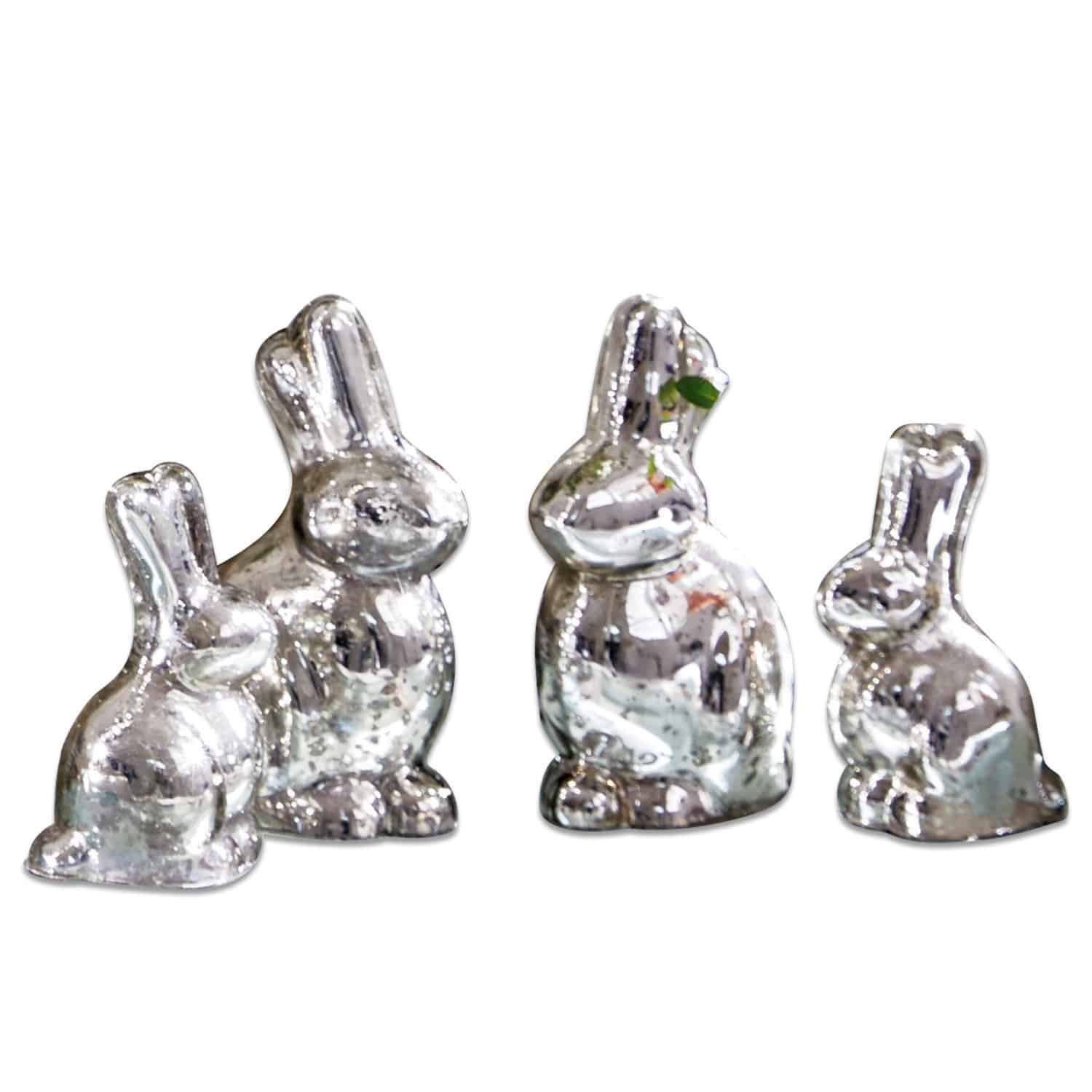 Diese entzückende Familie von Hasen wird Ihnen sicherlich ein Lächeln ins Gesicht zaubern. Die Langohren, die in verschiedenen Größen daherkommen, sind aus Glas hergestellt und von innen mit einer edlen Silberschicht verziert. Mit ihren ausgeklügelten Details faszinieren diese niedlichen Gefährten und bringen einen angenehmen Glanz in Ihr Zuhause.
