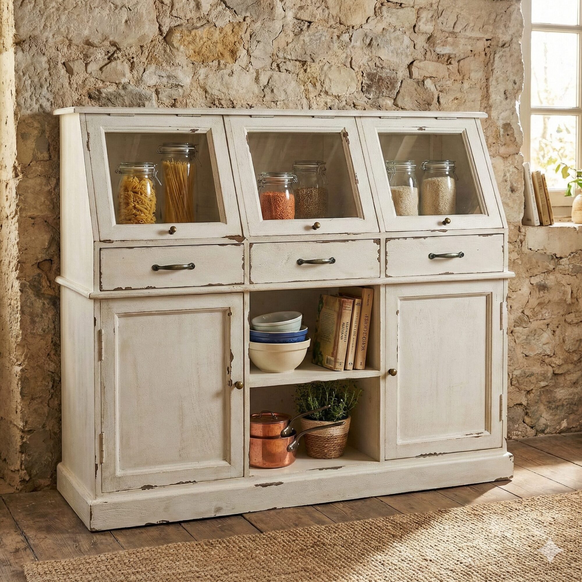 Ein echter Design-Schatz, den alle Liebhaber des Shabby-Chics sofort ins Herz schließen werden. Diese robuste und hochwertige Kommode besticht mit einer individuellen Optik im Vintage-Stil. Hinter den Glastüren können Deko-Objekte charmant präsentiert und aufbewahrt werden. Das edle Modell ist aus wertvollem Mangoholz und Glas gefertigt. Ein geschicktes Antik-Finish verleiht ihm nostalgischen Charme. Ein luxuriöses Design, an dem Sie sicherlich viele Jahre Freude haben werden. Dank drei Klappen, drei Schubladen, einem offenen Fach mit festem Boden und zwei Türen bietet die Kommode viel Stauraum. Perfekt, um alles Wichtige sicher aufzubewahren.