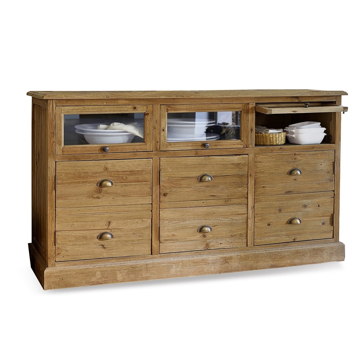 In dieser wunderschönen Kommode passt nicht nur viel hinein, sondern Sie werden sich auch sofort in dieses gute Stück verlieben. Es gibt viele Gründe dafür: Beginnend mit dem hochwertigen Material, aus dem dieses schöne Möbelstück gefertigt wurde: recyceltes Tannenholz. Es verleiht eine angenehm natürliche Atmosphäre. Die einzigartige Maserung macht das massive Platzwunder zu einem traumhaften Unikat. Hinter den drei Fächern mit Glasfronten und drei Schubladen-Türen finden diverse Gegenstände Platz. Die angenehm zu greifenden Griffe ergänzen die Glastüren harmonisch. Drei zusätzliche Fächer mit luftigen Glaseinsätzen bieten noch mehr Stauraum. Dort können Sie Dinge unterbringen, die Sie gerne im Blick haben möchten. Haben Sie besondere Dekoartikel, die viel zu schön sind, um sie im Schrank zu verstecken? Diese finden schließlich in den glasverkleideten Fächern den perfekten Platz. Gut organisiert und gleichzeitig dekorativ.