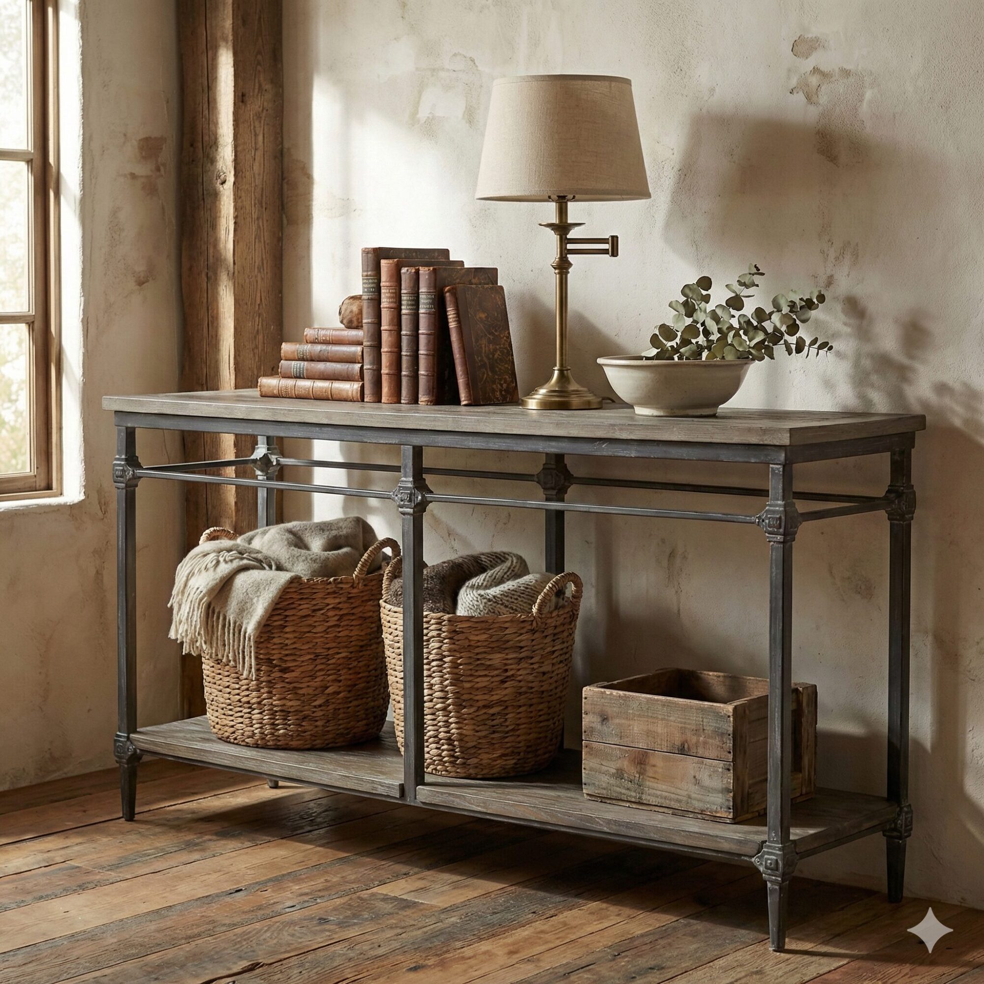 Ein elegantes und äußerst individuelles Möbelstück mit viel Designflair. Ein besonderes Merkmal sind die Intarsien im oberen Teil, die an edles Fischgrätparkett erinnern. Es besteht aus hochwertigem Ulmenholz. Durch den charmanten Materialmix mit Eisen entsteht ein ganz besonderer Look. Die Eisen-Elemente haben eine geschmackvolle, raue Oberfläche in einem edlen Farbton. Klar definierte Linien und eine feine antike Anmutung verleihen ihm seinen Charme. Ideal für das Wohnzimmer, um eine Stehlampe, Bildbände und Windlichter darauf zu platzieren. Auf dem unteren Ablageboden könnte auch ein großer Korb mit gemütlichen Decken und Kissen Platz finden. Alternativ kann das Modell im Flur oder Schlafzimmer genutzt werden, vielleicht auch, um Bücher oder Zeitschriften darauf zu stapeln. Selbst das Badezimmer, die Küche oder ein Arbeitszimmer profitieren von ihm. Je nach Raum können hier Bad- oder Küchenutensilien, Make-up oder was auch immer ein hübsches Plätzchen in Ihrem Zuhause sucht, präsentiert werden. Zeigen Sie Ihren raffinierten Sinn für Inneneinrichtung. Ideal für jeden Wohnstil, von Loft über antik bis hin zu Shabby-Chic und Landhaus-Stil.