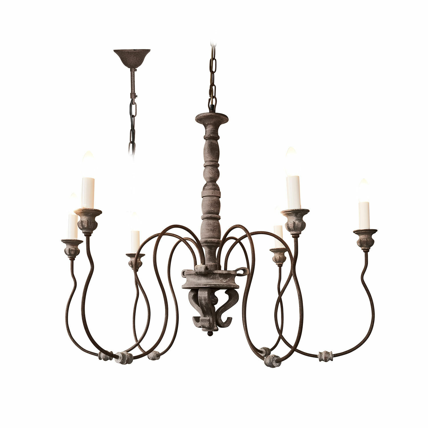 Sie hegen eine heimliche Vorliebe für die alten Zeiten, in denen nur Kerzen für Licht sorgten und bei Dinner-Partys das edle Silber, Kristall und der Schmuck der Damen glänzten? Sie können diese festliche und gemütliche Atmosphäre auch im 21. Jahrhundert in Ihrem Zuhause kreieren, indem Sie abends zahlreiche echte Kerzen anzünden und diesen Leuchter über Ihrem Esstisch platzieren, der so aussieht, als könnte er aus einem eleganten Salon stammen. Sein authentisches Antik-Finish betont seinen antiken Charme und die in Kerzenform gestalteten Lampenfassungen erzeugen das Gefühl, als ob echte Kerzen Ihren Esstisch beleuchten würden. Wie seine glamourösen Vorgänger ist auch dieser Leuchter ein Meisterstück traditioneller Handwerkskunst. Das Herzstück ist der opulent gestaltete Mittelteil, der handgedrechselt zu sein scheint und von sechs elegant geschmiedeten Eisenarmen umgeben wird. Mit seinem einzigartigen Design passt der Leuchter zu verschiedenen Einrichtungsstilen und sieht sowohl in einem Landhaus-Esszimmer als auch in einem großzügigen Eingangsbereich oder als unkonventioneller Stilbruch in einem modernen Loft großartig aus. Tipp: Wenn Sie Leuchtmittel in klassischer Kerzenform verwenden, vervollständigen Sie den nostalgischen Look des Leuchters.
