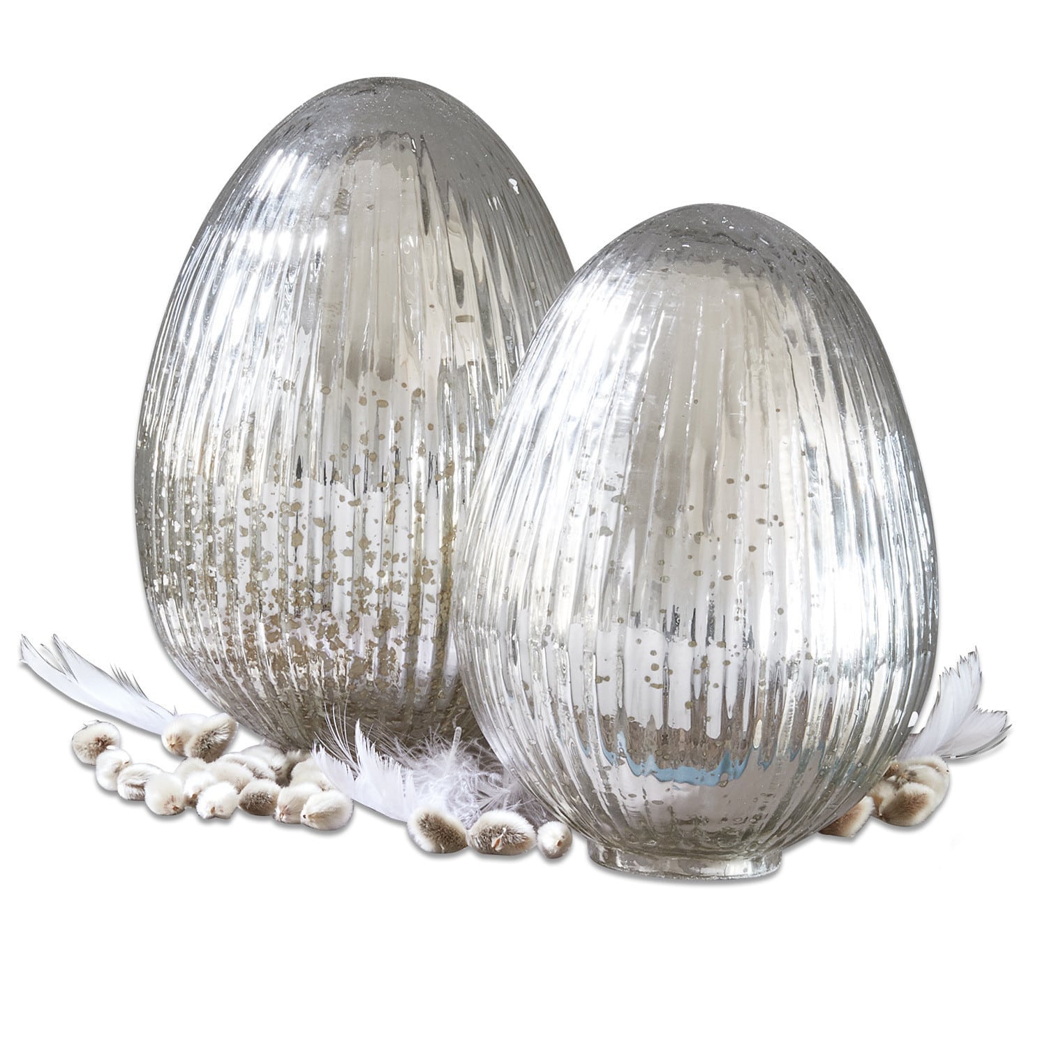 Verleihen Sie Ostern luxuriösen Glanz mit diesen edlen Deko-Eiern. Die wunderschönen Stücke aus zartem Glas sind innen verspiegelt und mit einer filigranen Reliefstruktur versehen, die ihnen einen romantischen Charme verleiht. Ausgestattet mit Moosgummi-Gleitern auf der Unterseite, eignen sie sich perfekt zum Dekorieren von Tisch, Regal oder Fensterbank. Diese Eier veredeln den Landhaus- bzw. Shabby-Chic-Stil und können mit Blüten oder anderen Osterschmuck kombiniert werden. Auch nach Ostern sorgen sie für elegante Akzente und sind ideal für Liebhaber filigraner Accessoires mit Stil.
